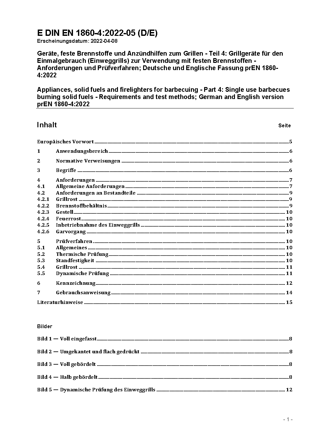 Appliances, solid fuels and firelighters for barbecueing - Part 4: Single use barbecues burning solid fuels, Requirements and test methods; German version EN 1860-4:2004