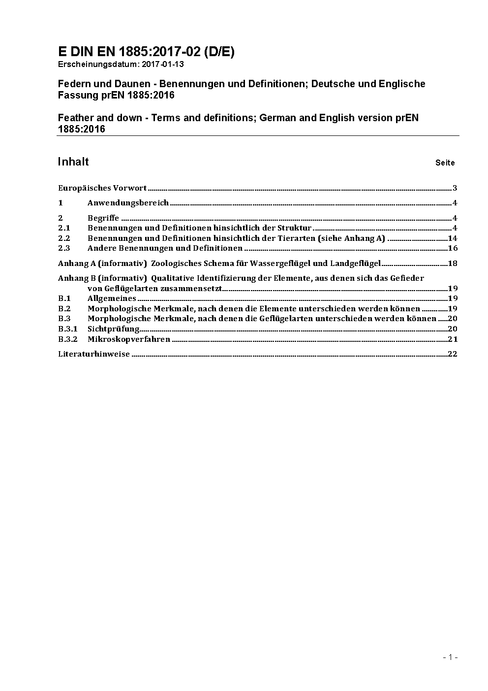 Feather and down - Terms and definitions (includes amendment A1:2003); German version EN 1885:1998 + A1:2003
