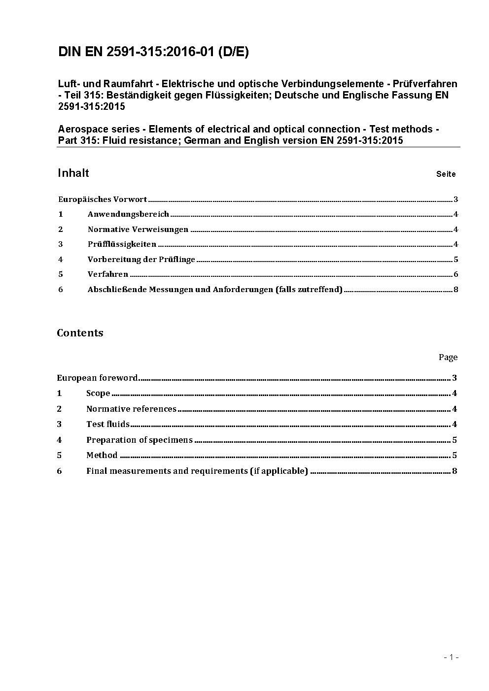 Aerospace series - Elements of electrical and optical connection; test methods - Part 315: Fluid resistance; German version EN 2591-315:1998.