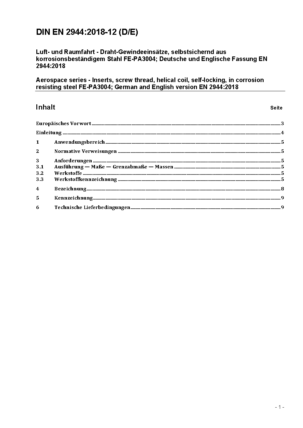 Aerospace series - Inserts, screw thread, helical coil, self-locking, in corrosion resisting alloy FE-PA3004; German version EN 2944:1998
