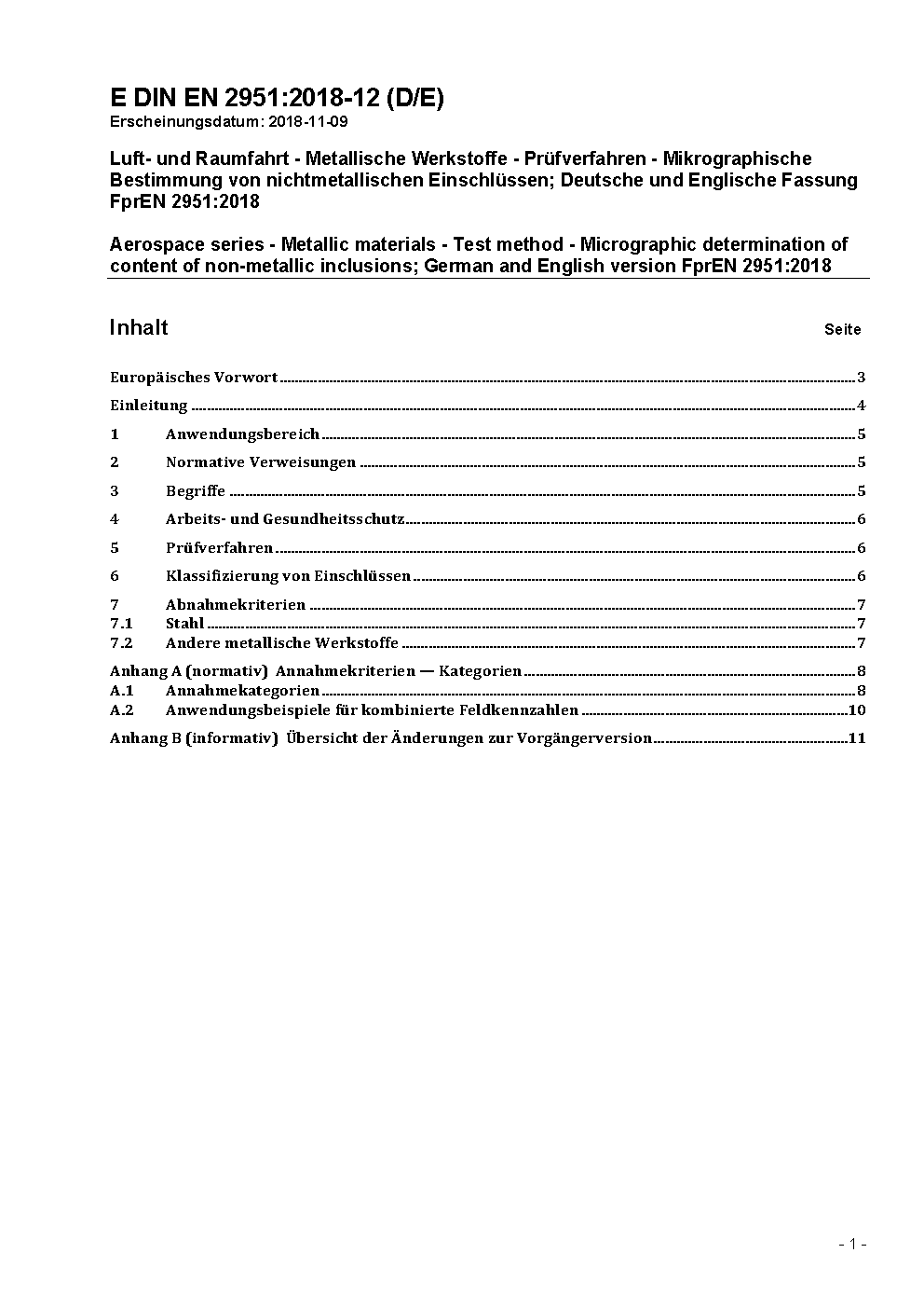The document specifies the general requirements for the micrographic determination of content of non-metallic inclusions of metallic materials for aerospace applications. It also gives tables of standard acceptance criteria for particular steel types. It shall be applied when referred to in the EN technical specification or material standard unless otherwise specified on the drawing, order or inspection schedule. The document is mainly applicable to steel but may be used on other metallic materials. It is normally not applicable to austenitic corrosion resisting steel, other than precipitation hardening, or to free-machining steel unless invoked in the material standards.