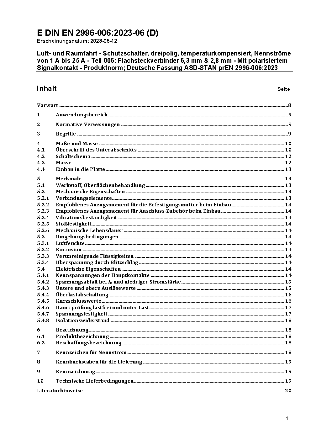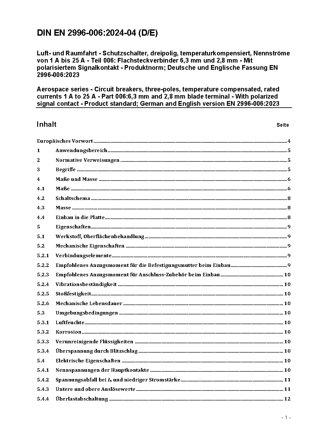 Luft- und Raumfahrt - Schutzschalter, dreipolig, temperaturkompensiert, Nennströme von 1 A bis 25 A - Teil 006: Flachsteckverbinder 6,3 mm & 2,8 mm - Mit polarisiertem Signalkontakt - Produktnorm; Deutsche Fassung ASD-STAN prEN 2996-006:2023