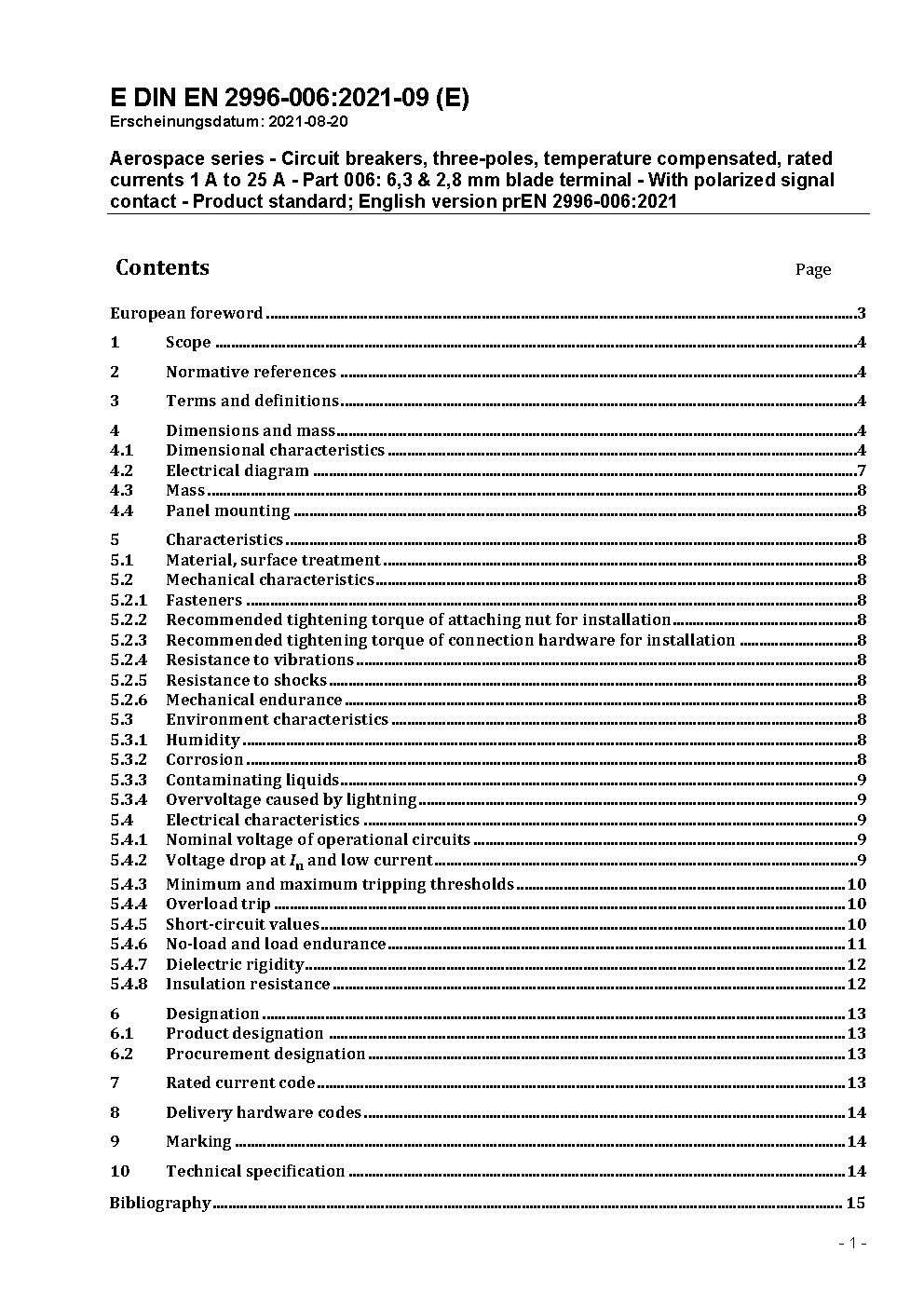 Aerospace series - Circuit breakers, three-poles, temperature compensated, rated currents 1 A to 25 A - Part 006:6,3 mm & 2,8 mm blade terminal - With polarized signal contact - Product standard; German version ASD-STAN prEN 2996-006:2023