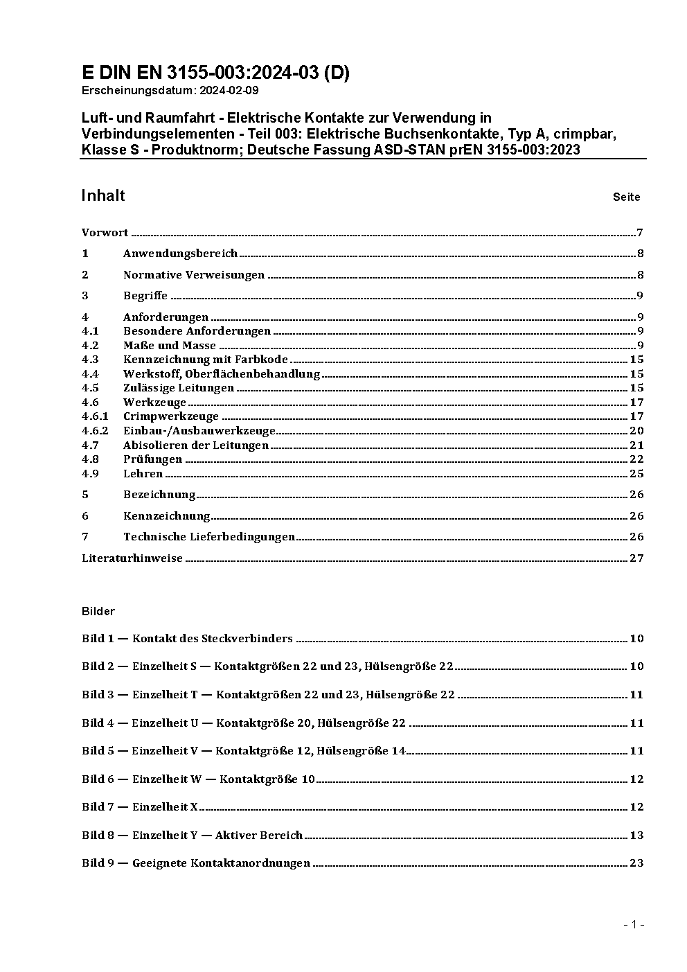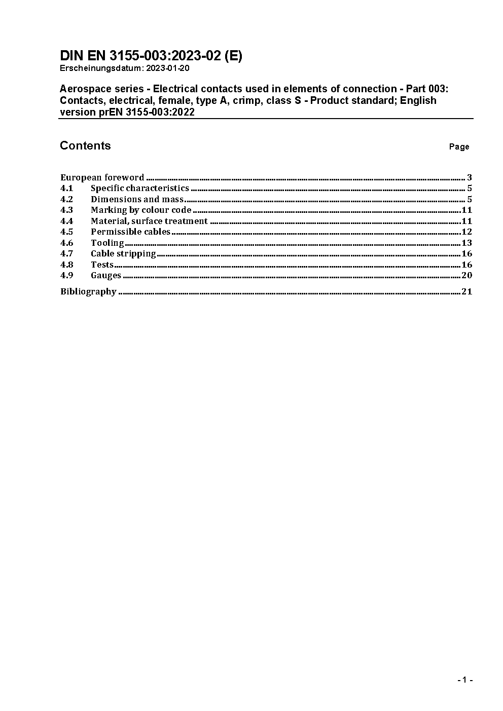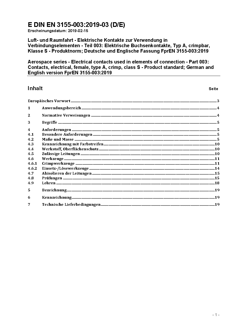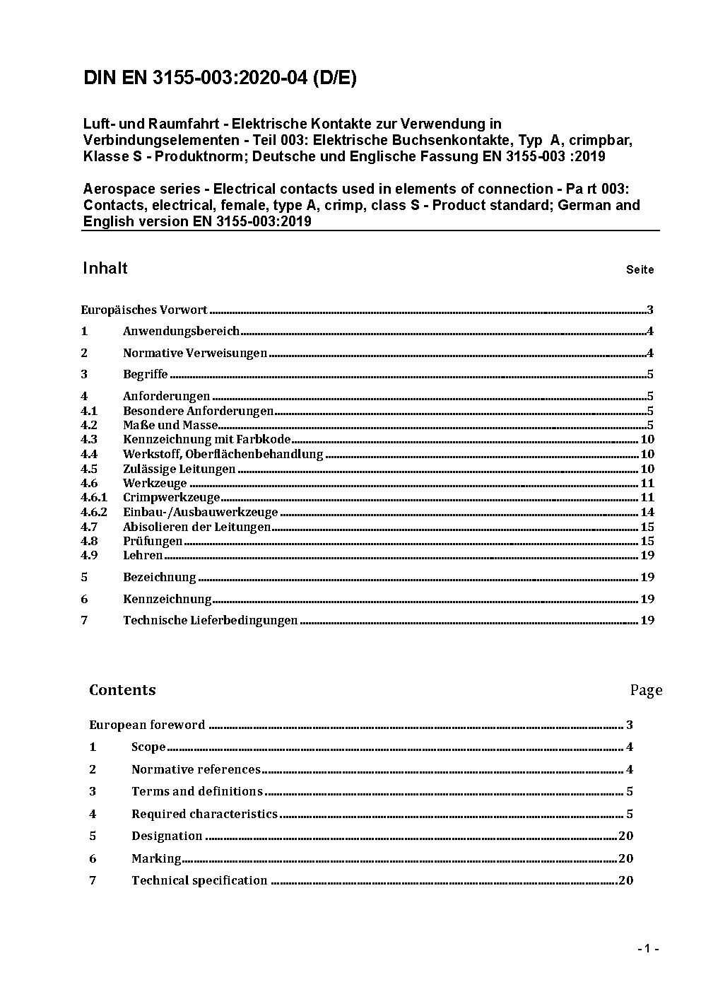 Aerospace series - Electrical contacts used in elements of connection - Part 003: Contacts, electrical, female, type A, crimp, class S - Product standard; German and English version EN 3155-003:2005.