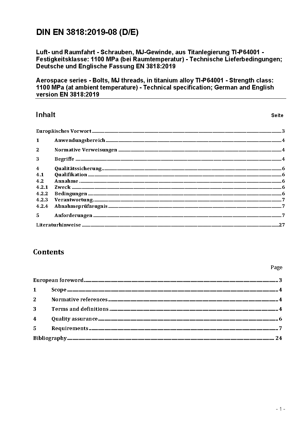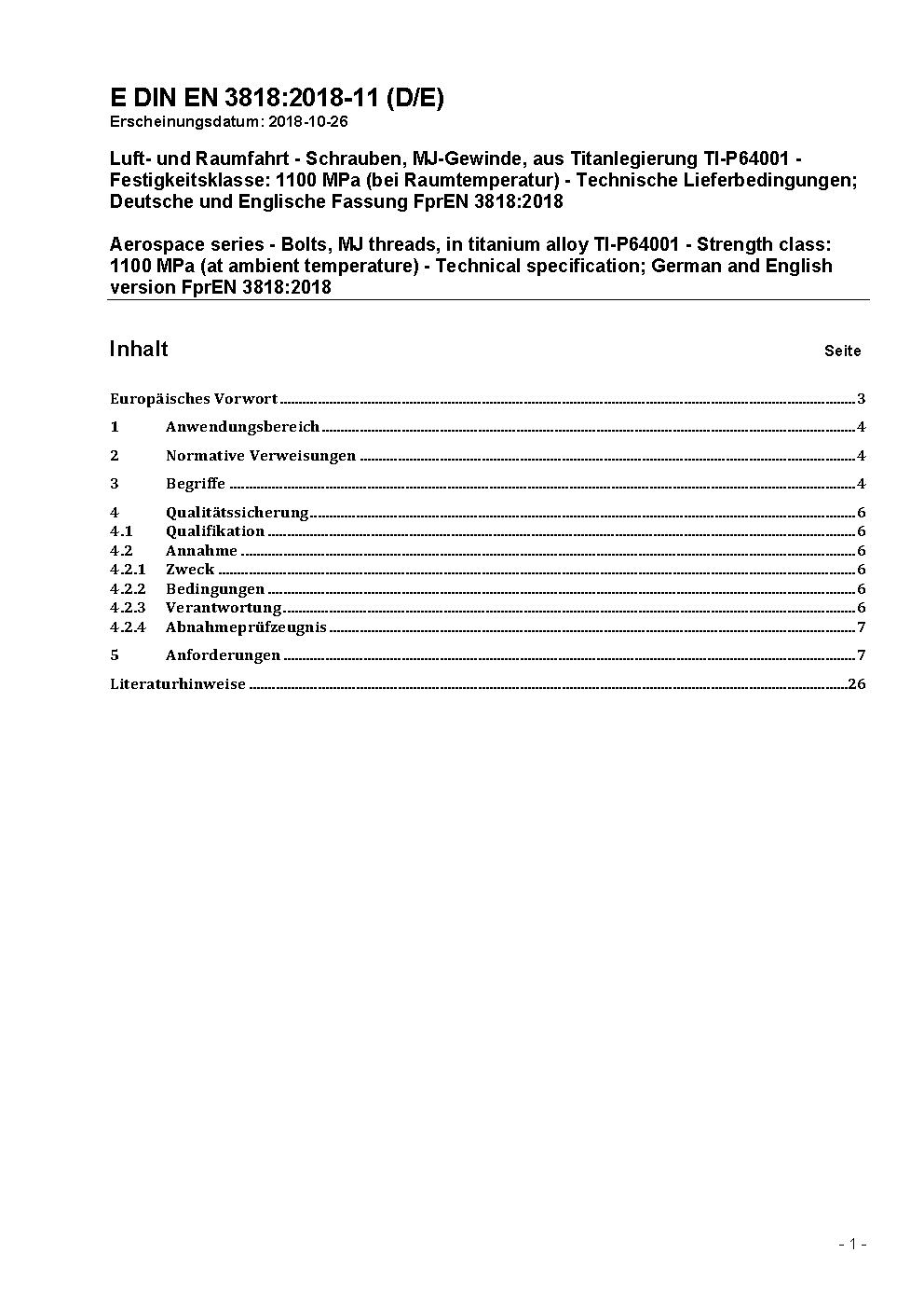 Aerospace series - Bolts, MJ threads, in titanium alloy TI-P64001 - Strength class: 1100 MPa (at ambient temperature) - Technical specification; German and English version EN 3818:2004