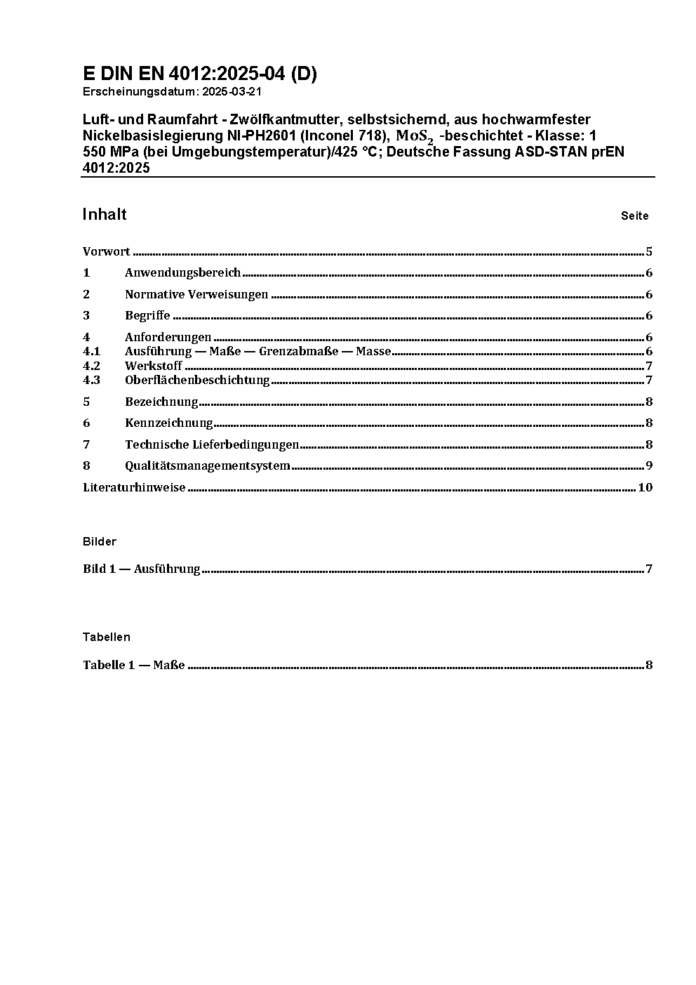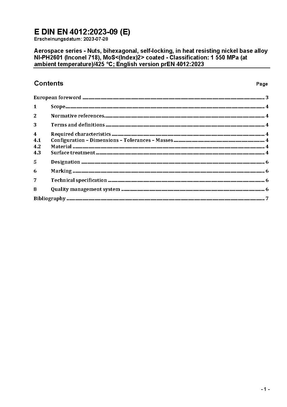 Aerospace series - Nuts, bihexagonal, self-locking, in heat resisting nickel base alloy NI-PH2601 (Inconel 718), MoS<(Index)2> coated - Classification: 1550 MPa (at ambient temperature)/425 °C; German and English version EN 4012:2004