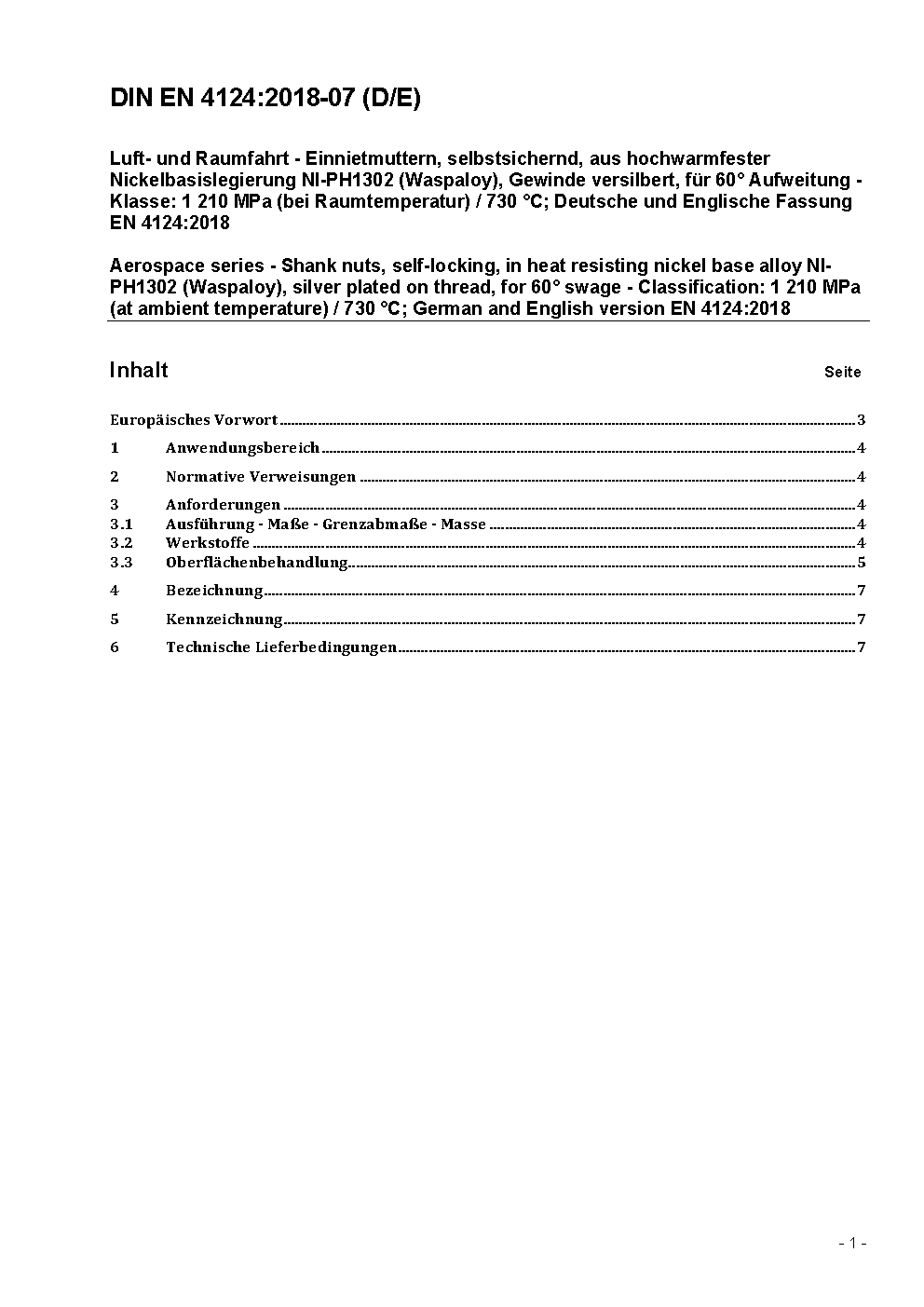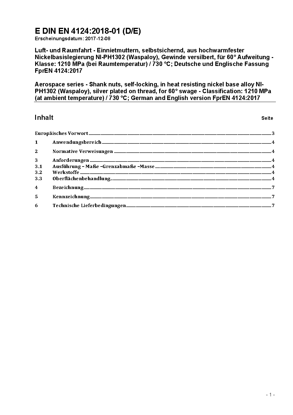 Aerospace series - Shank nuts, self-locking, in heat resisting nickel base alloy NI-PH1302 (Waspaloy), silver plated on thread, for 60° swage - Classification: 1210 MPa (at ambient temperature) / 730 °C; German and English version EN 4124:2004