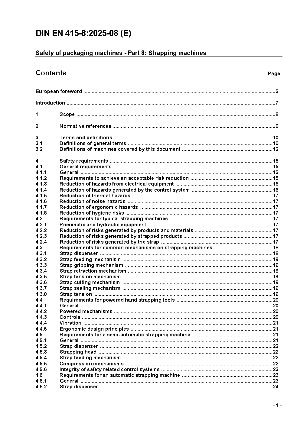 This European Standard establishes safety requirements for power operated strapping machines and the collating systems that are associated with them. This group of machines is defined in detail in clause 3 of this standard, with diagrams illustrating examples of the principle of operation of each machine type. This standard covers the safety requirements for machine design, construction, installation, commissioning, operation, adjustment, maintenance and cleaning. This part of EN 415 applies primarily to machines manufactured after the date of issue of this standard. Exclusions: This standard does not cover strapping tools that are powered exclusively by hand. This standard does not cover in detail the health, safety or hygiene hazards associated with the products which may be handled by strapping machines, but does include general advice on these subjects. This standard does not cover the hazards that may be associated with decommissioning strapping machines.
