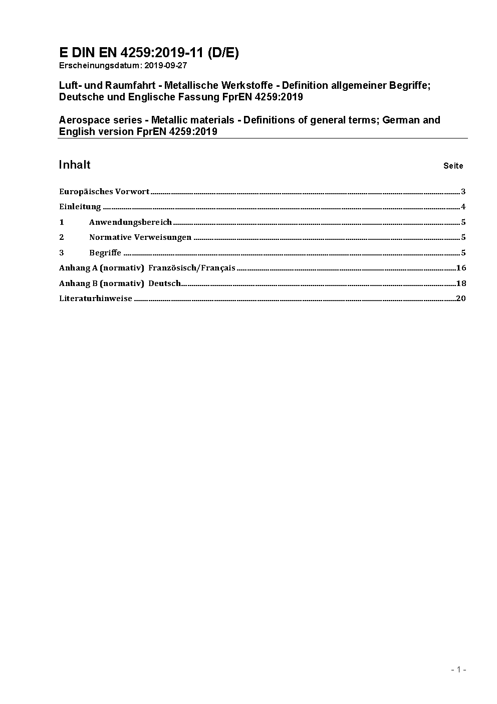 Luft- und Raumfahrt - Metallische Werkstoffe - Definition allgemeiner Begriffe; Deutsche und Englische Fassung FprEN 4259:2019