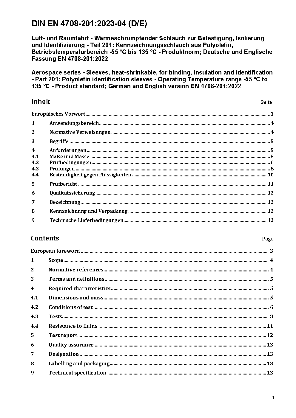 Aerospace series - Sleeves, heat-shrinkable, for binding, insulation and identification - Part 201: Polyolefin identification sleeves - Operating Temperature range -55 °C to 135 °C - Product standard; German and English version FprEN 4708-201:2022