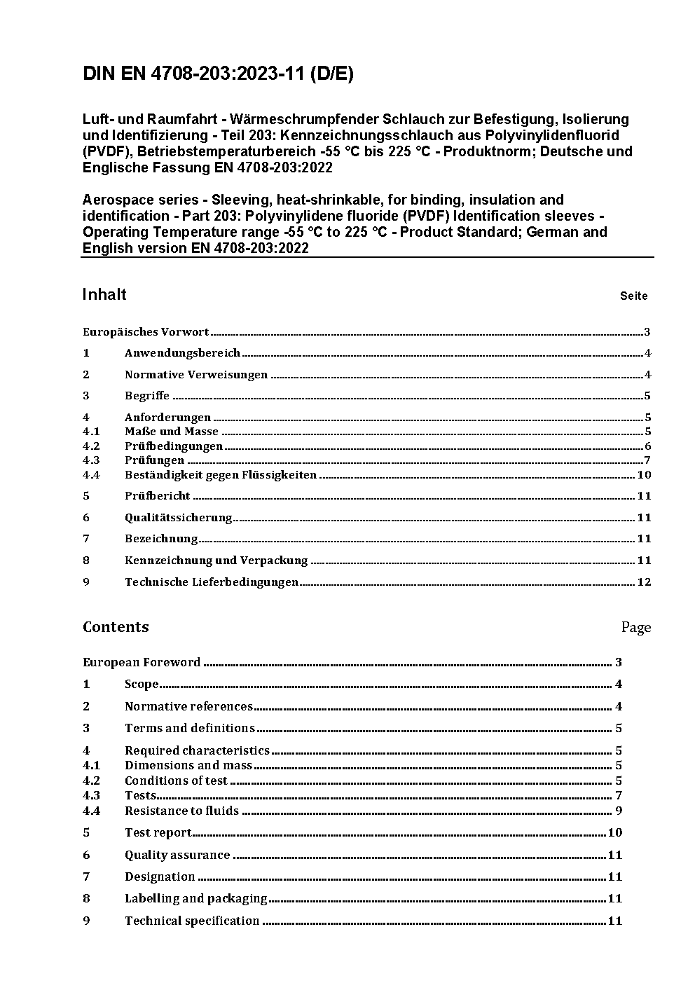 Aerospace series - Sleeving, heat-shrinkable, for binding, insulation and identification - Part 203: Polyvinylidene fluoride (PVDF) Identification sleeves - Operating Temperature range -55 °C to 225 °C - Product Standard; German and English version FprEN 4708-203:2022