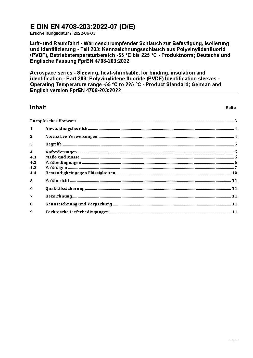 Luft- und Raumfahrt - Wärmeschrumpfender Schlauch zur Befestigung, Isolierung und Identifizierung - Teil 203: Kennzeichnungsschlauch aus Polyvinylidenfluorid (PVDF), Betriebstemperaturbereich -55 °C bis 225 °C - Produktnorm; Deutsche und Englische Fassung FprEN 4708-203:2022