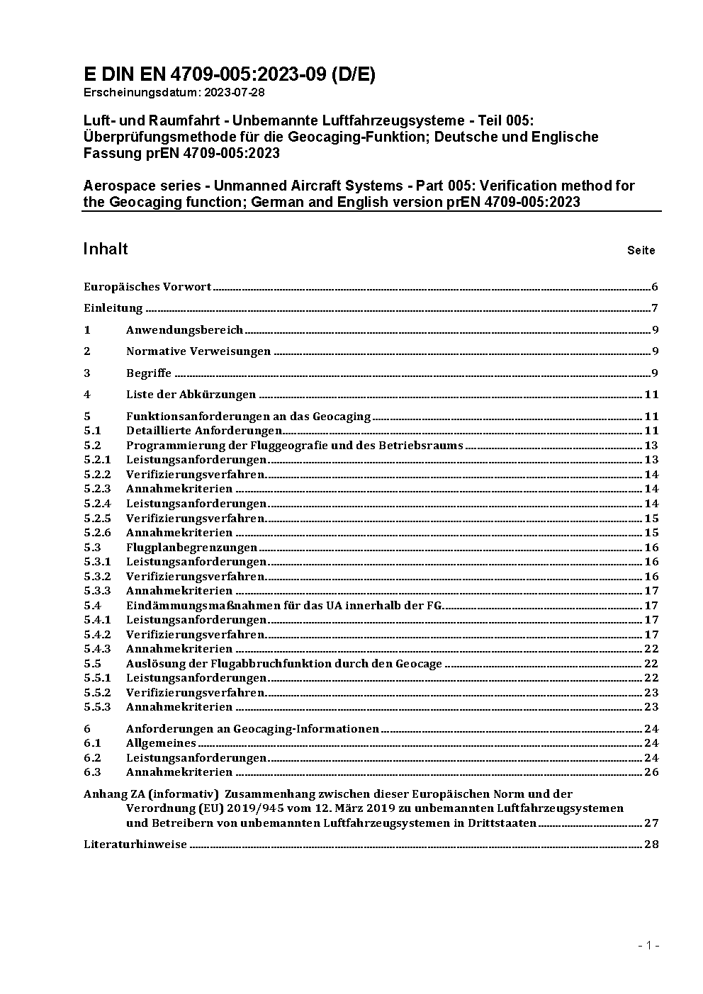 Aerospace series - Unmanned Aircraft Systems - Part 005: Verification method for the Geocaging function; German and English version prEN 4709-005:2023