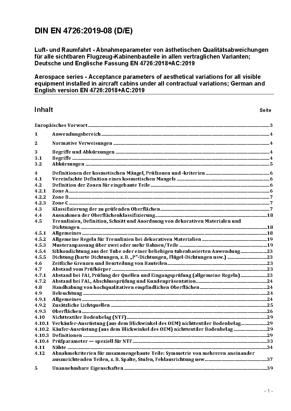 Aerospace series - Acceptance parameters of aesthetical variations for all visible equipment installed in aircraft cabins under all contractual variations; German and English version EN 4726:2018+AC:2019
