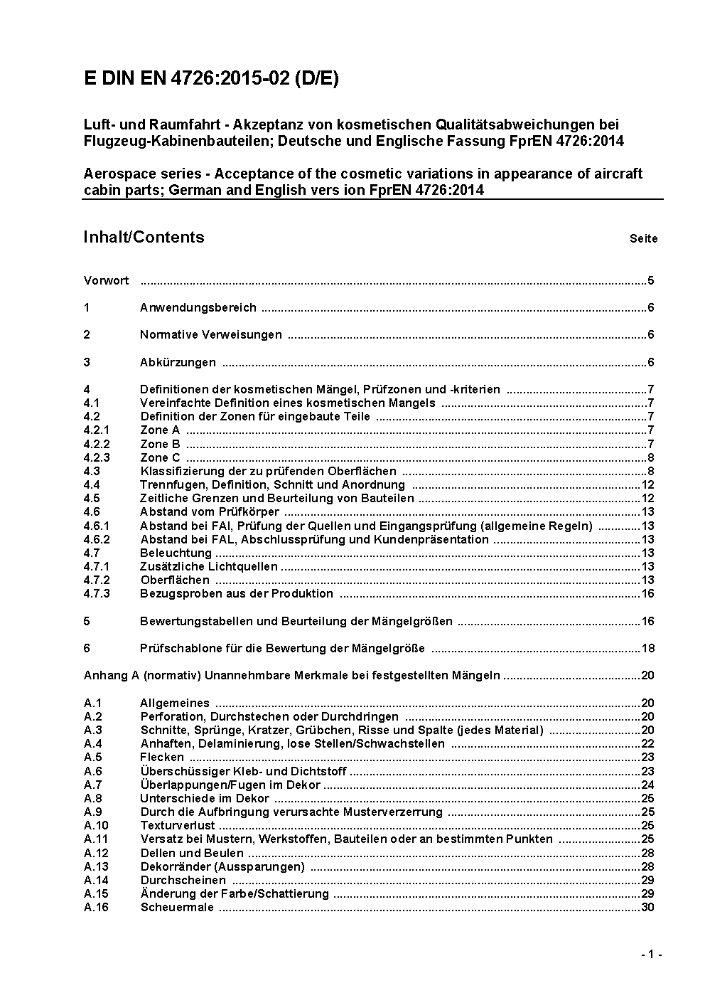 Luft- und Raumfahrt - Abnahmeparameter von ästhetischen Qualitätsabweichungen für alle sichtbaren Flugzeug-Kabinenbauteile in allen vertraglichen Varianten; Deutsche und Englische Fassung EN 4726:2018+AC:2019