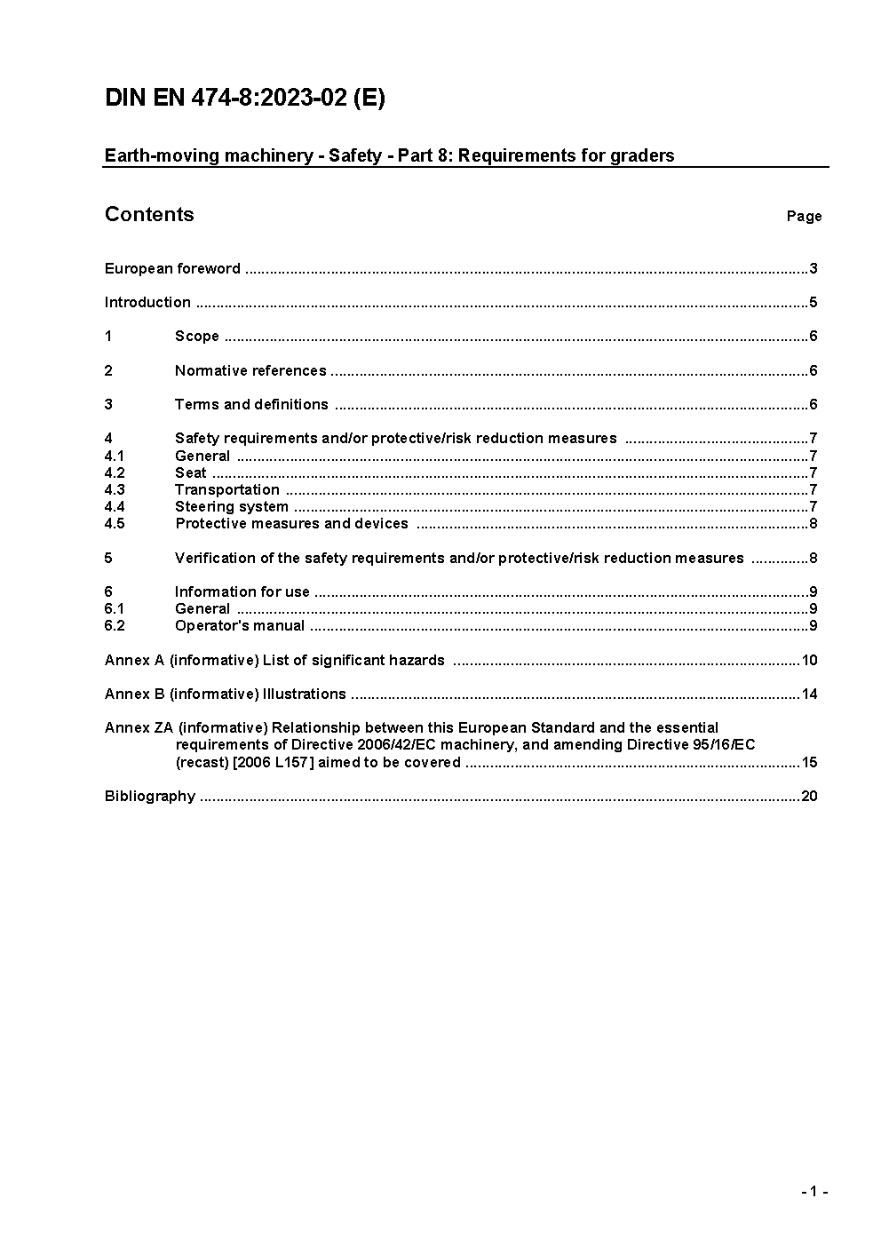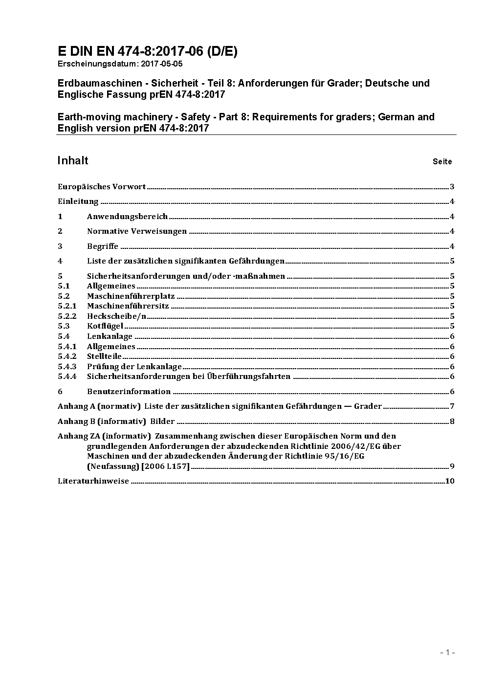 This standard specifies the specific safety requirements for graders and prescribes the appropriate technical measures to eliminate or reduce risks arising from the significant hazards associated with graders. This standard shall be used together with DIN EN 474-1:2001.