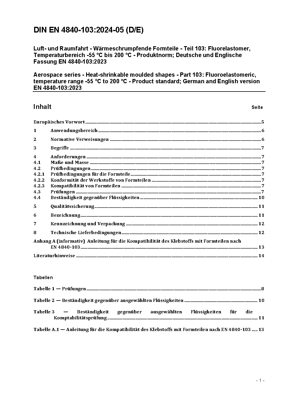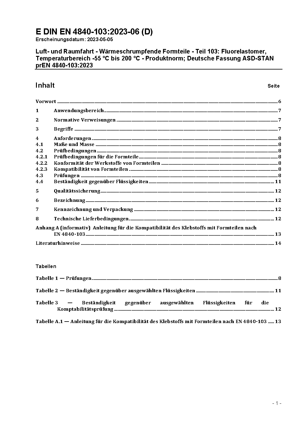 Luft- und Raumfahrt - Wärmeschrumpfende Formteile - Teil 103: Fluorelastomer, Temperaturbereich -55 °C bis 200 °C - Produktnorm; Deutsche Fassung ASD-STAN prEN 4840-103:2023