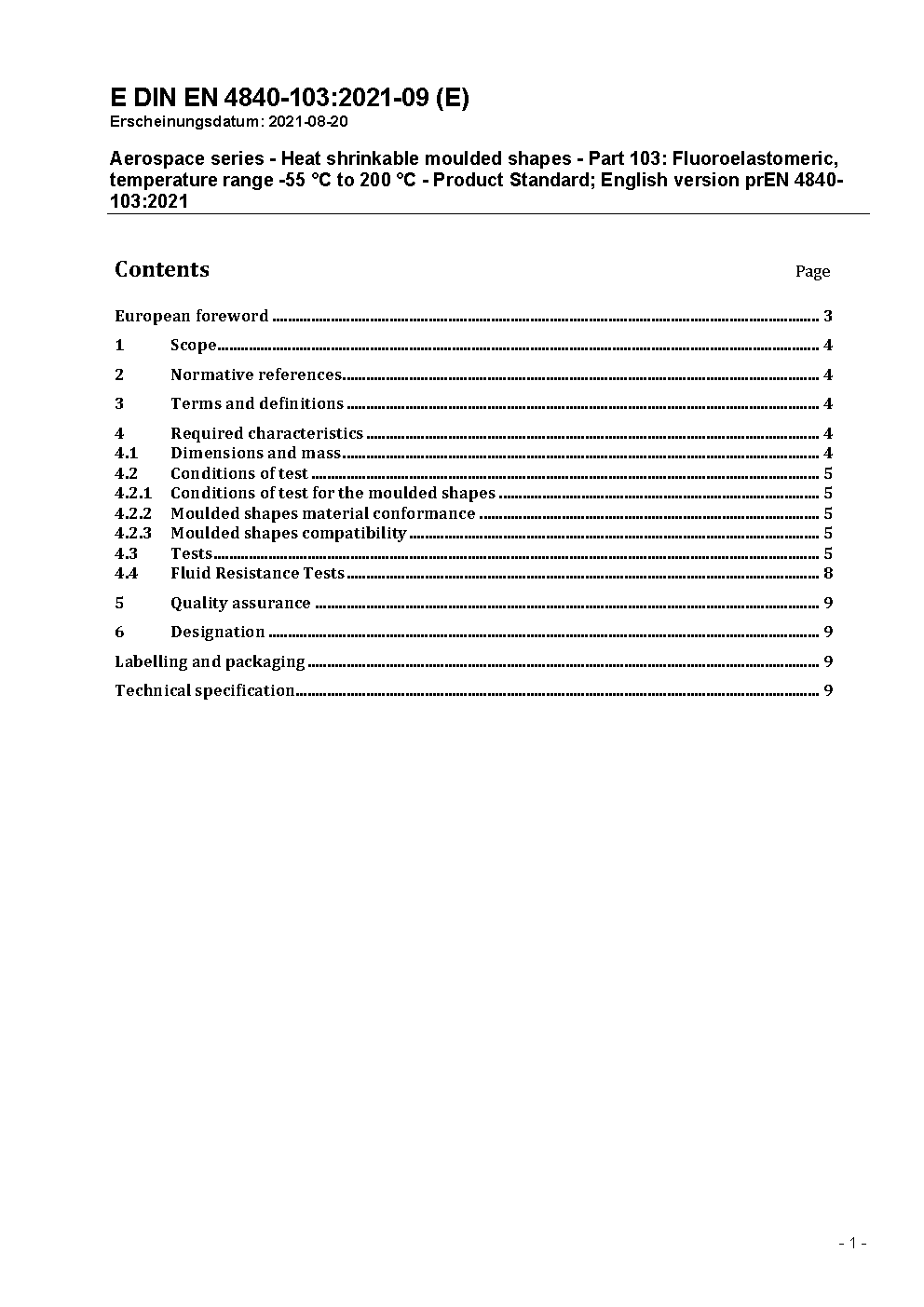 Aerospace series - Heat shrinkable moulded shapes - Part 103: Fluoroelastomeric, temperature range -55 °C to 200 °C - Product standard; German version ASD-STAN prEN 4840-103:2023