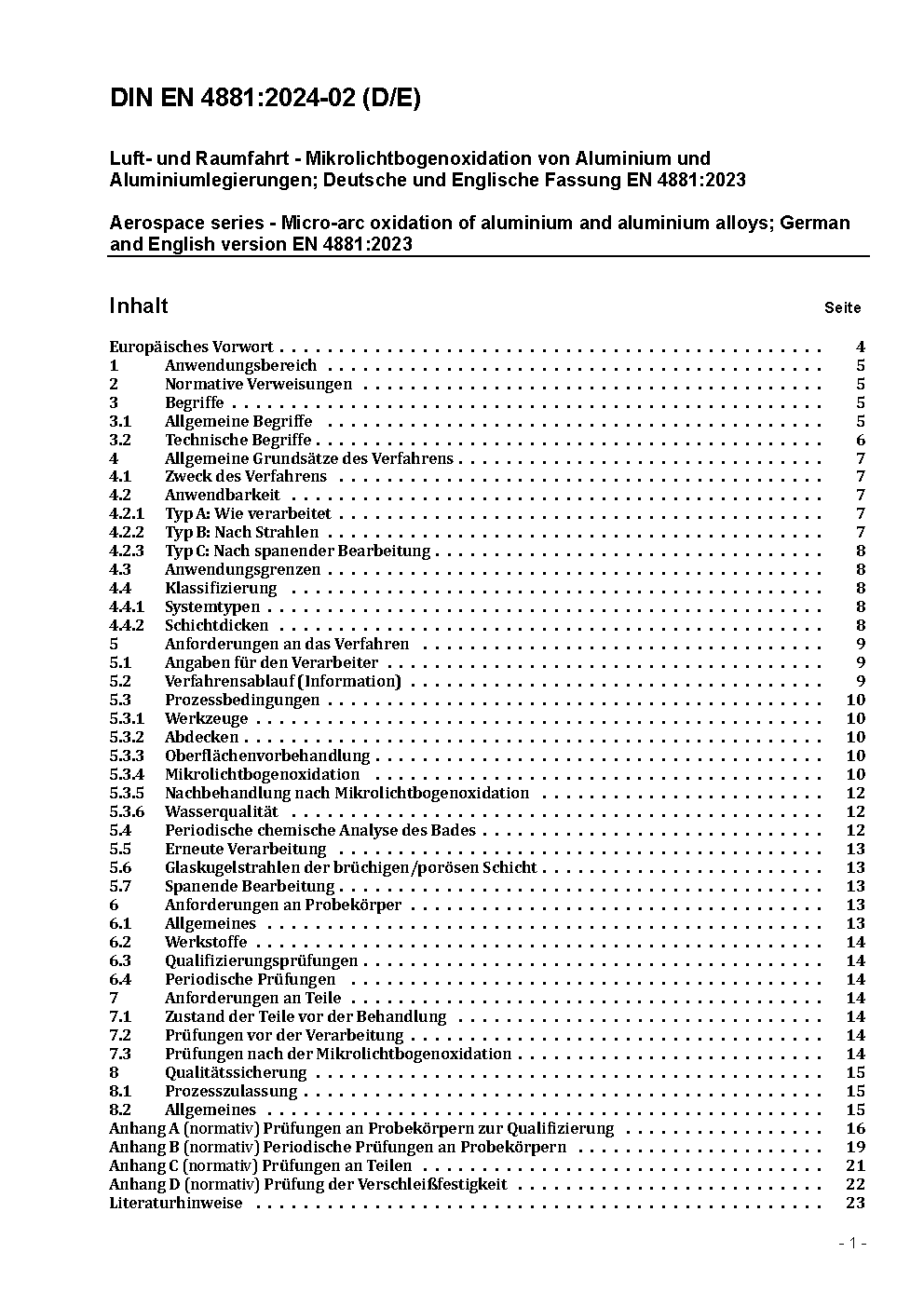 Luft- und Raumfahrt - Mikrolichtbogenoxidation von Aluminium und Aluminiumlegierungen; Deutsche und Englische Fassung EN 4881:2023