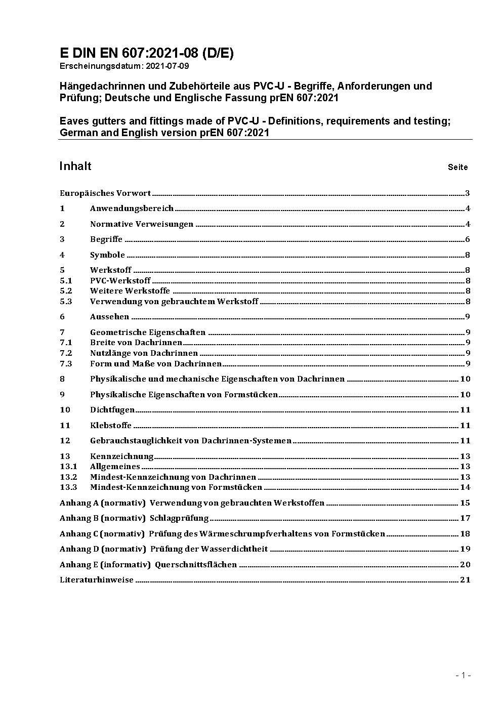 Eaves gutters and fittings made of PVC-U - Definitions, requirements and testing; German version EN 607:2004