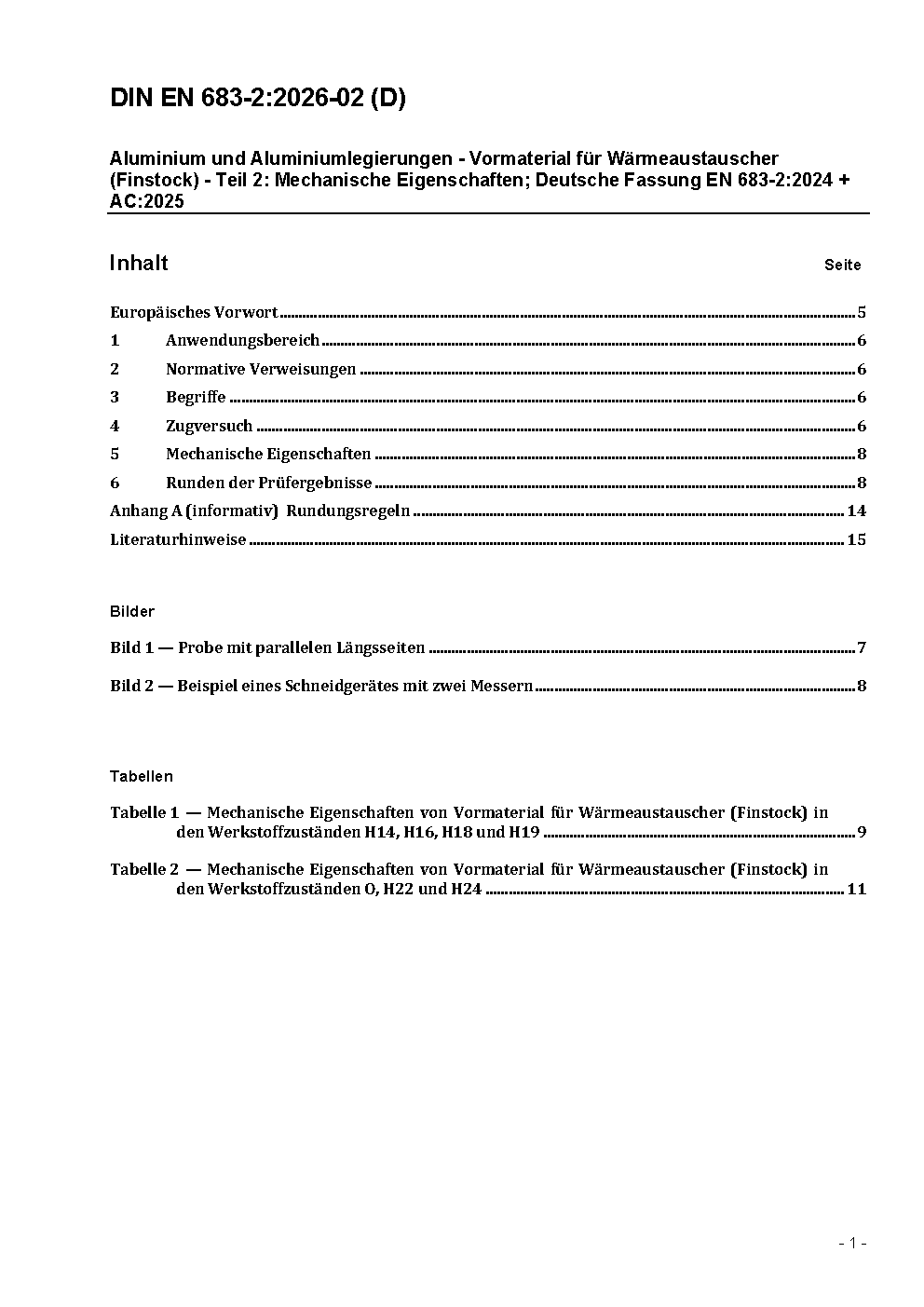 Aluminium und Aluminiumlegierungen - Vormaterial für Wärmeaustauscher (Finstock) - Teil 2: Mechanische Eigenschaften; Deutsche Fassung EN 683-2:2024 + AC:2025