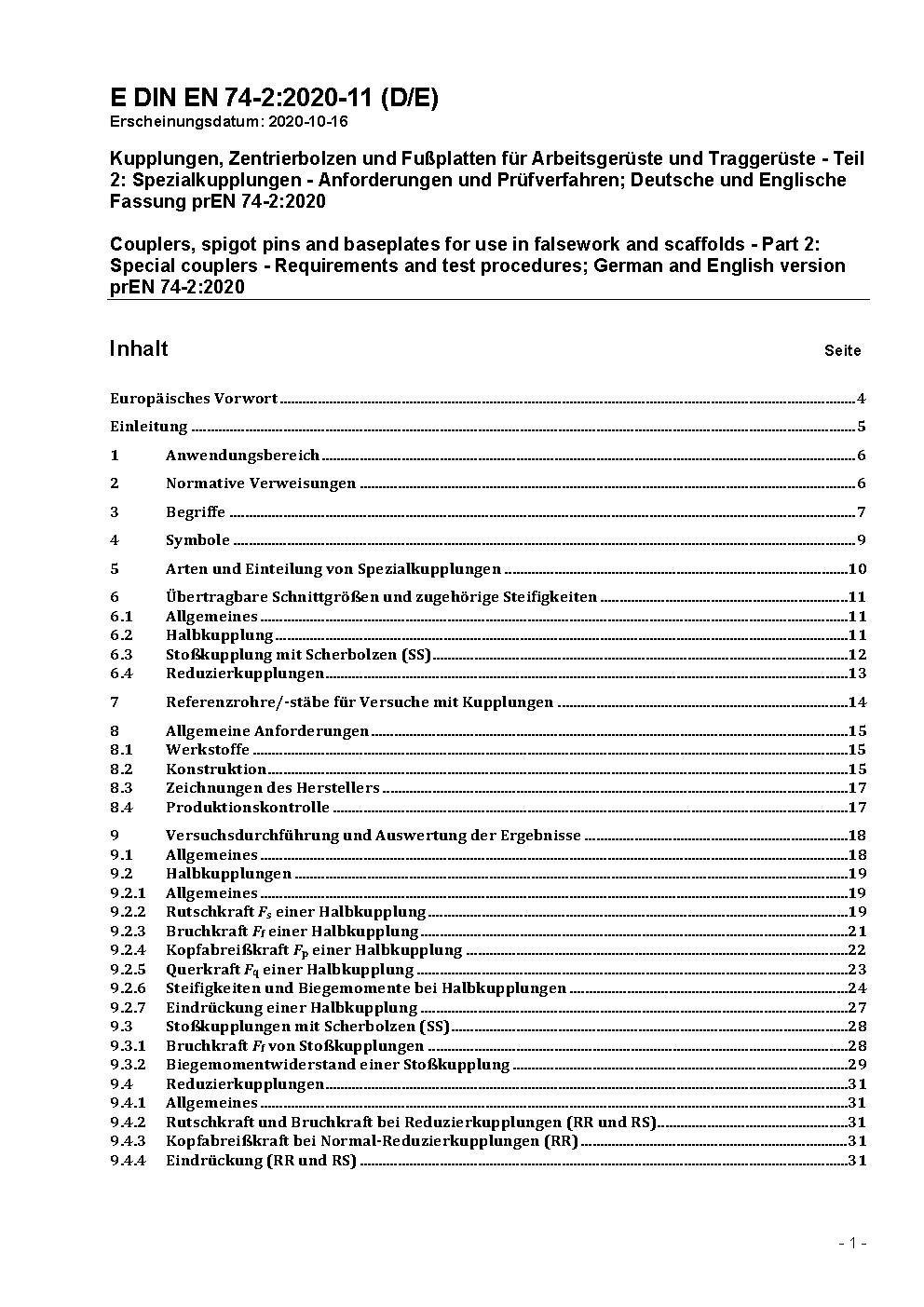This part of the standard specifies materials, design requirements, strength classes, corrosion protection requirements, test and assessment procedures and ongoing production control recommendations for half couplers, girder couplers, putlog couplers, stair tread brackets and loose spigot pins.