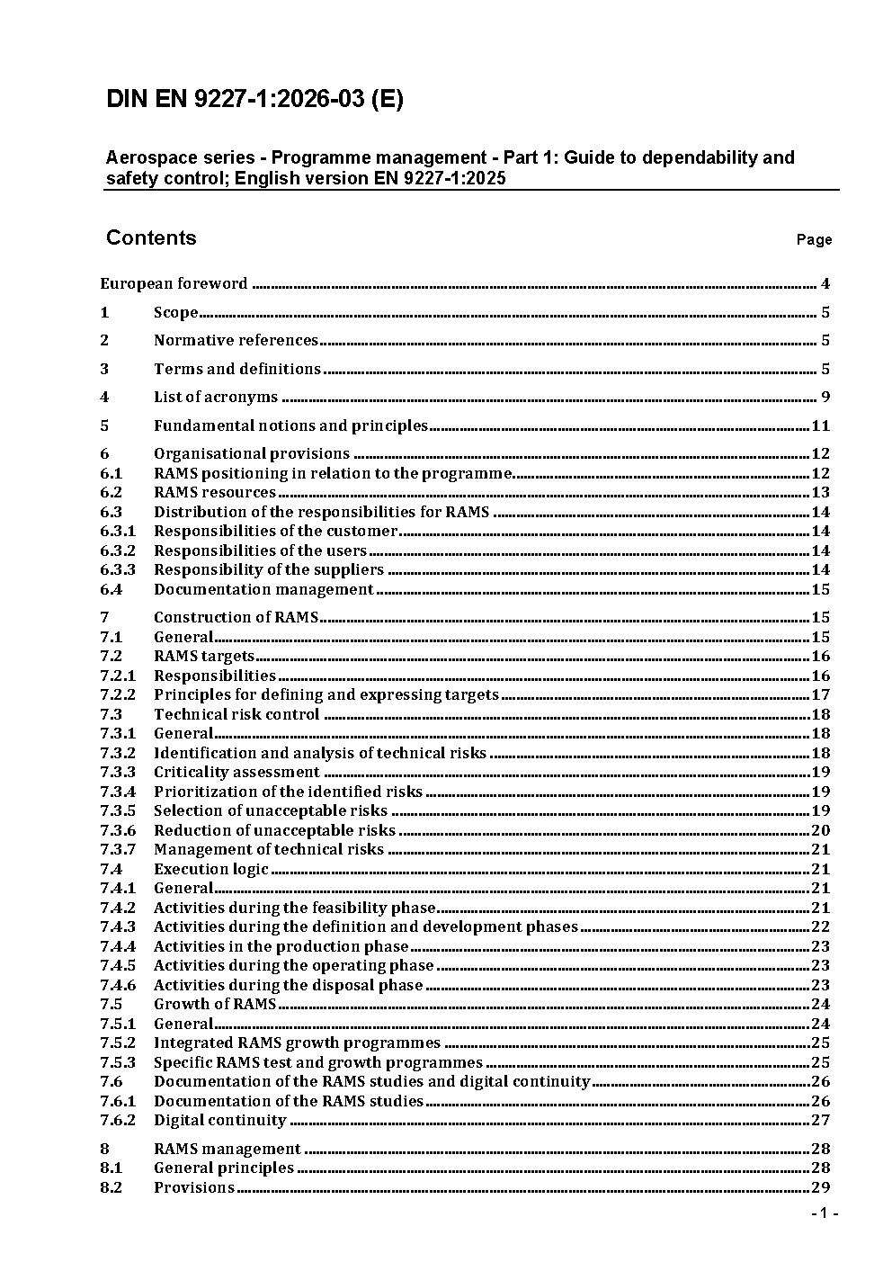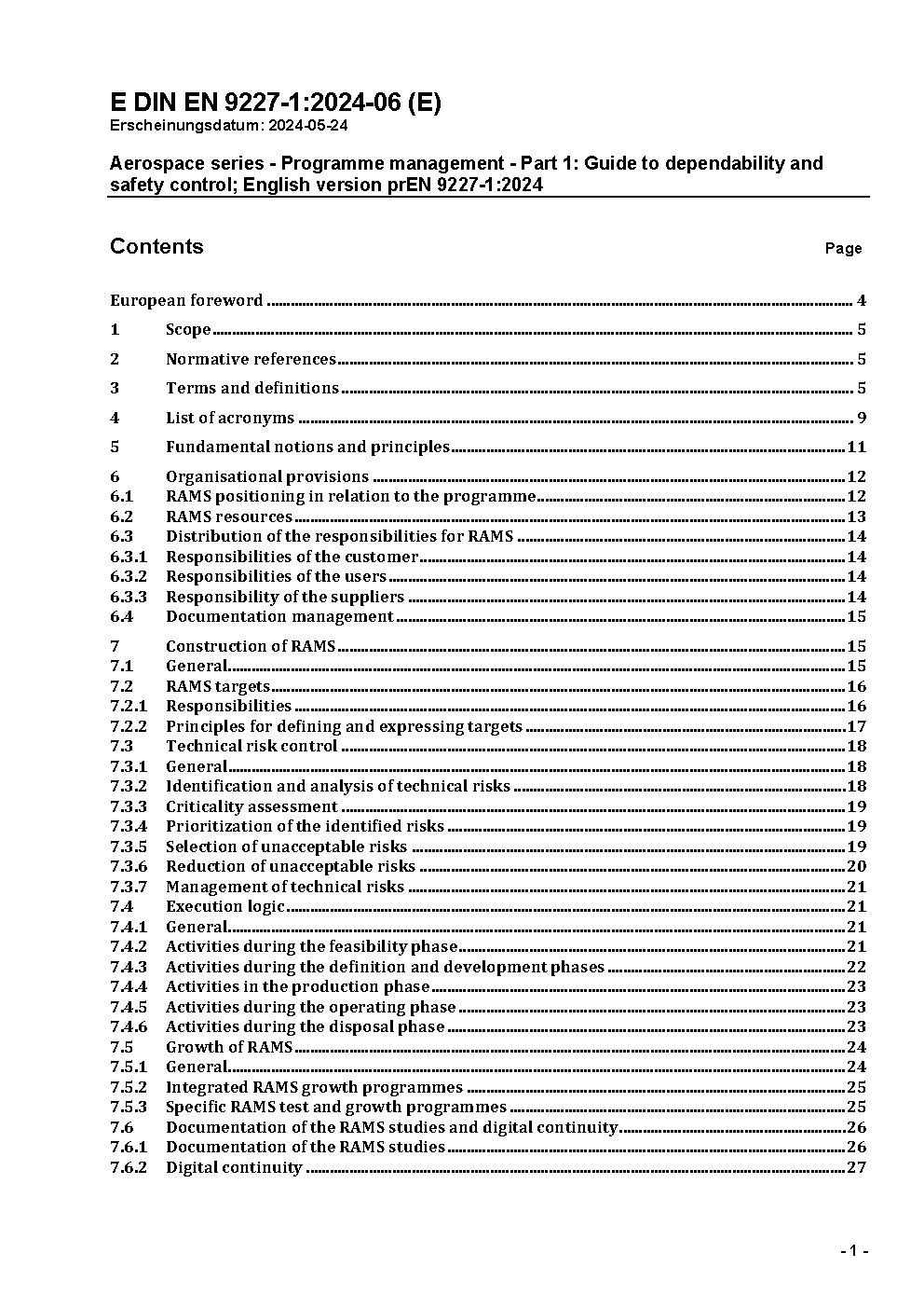 Aerospace series - Programme management - Part 1: Guide to dependability and safety control; English version prEN 9227-1:2024