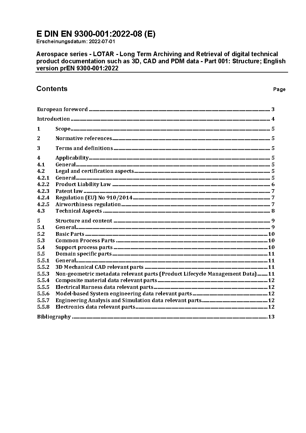 Luft- und Raumfahrt - LOTAR Langzeitarchivierung und Bereitstellung digitaler technischer Produktdokumentationen, wie zum Beispiel von 3D-, CAD- und PDM-Daten - Teil 001: Struktur; Englische Fassung prEN 9300-001:2022