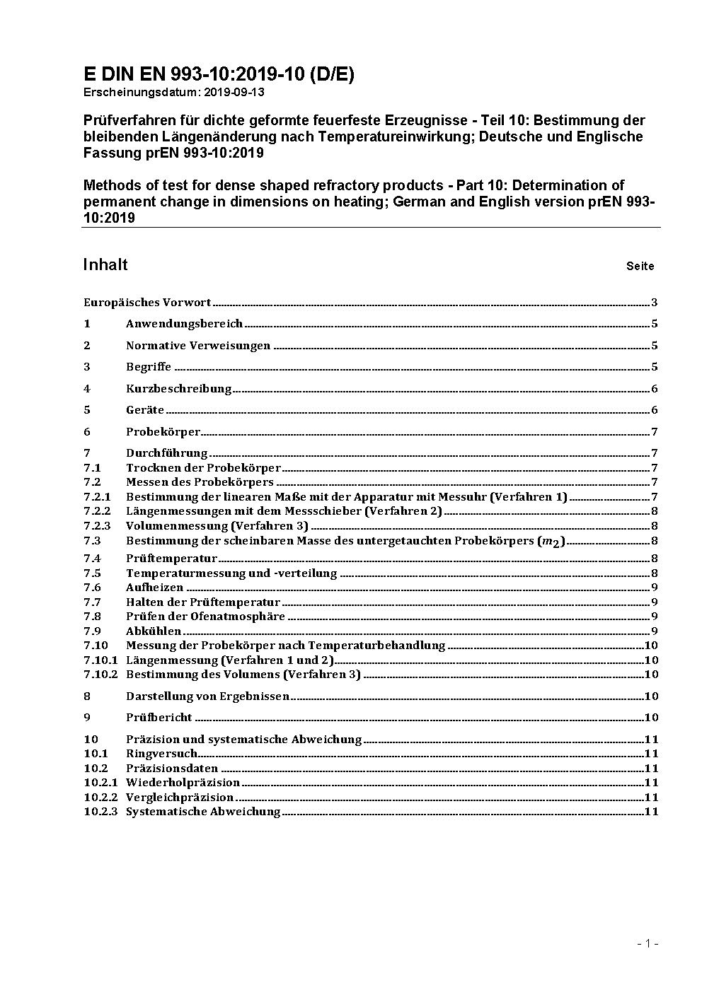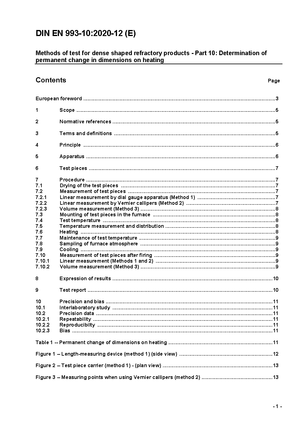The document specifies three methods for the determination of the permanent change in dimensions on heating of dense shaped refractory products.