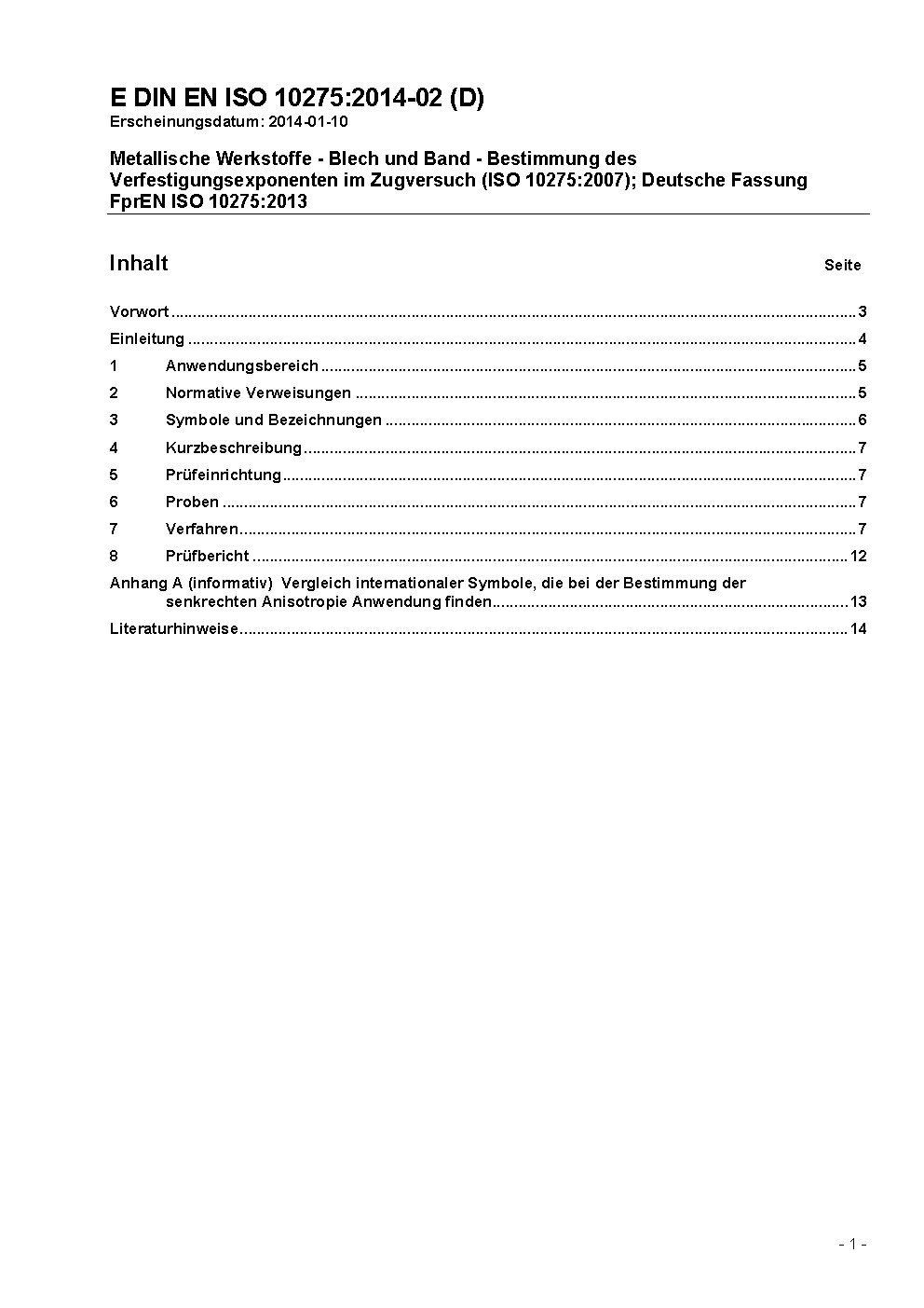 Metallic materials - Sheet and strip - Determination of tensile strain hardening exponent (ISO 10275:2007); German version FprEN ISO 10275:2013
