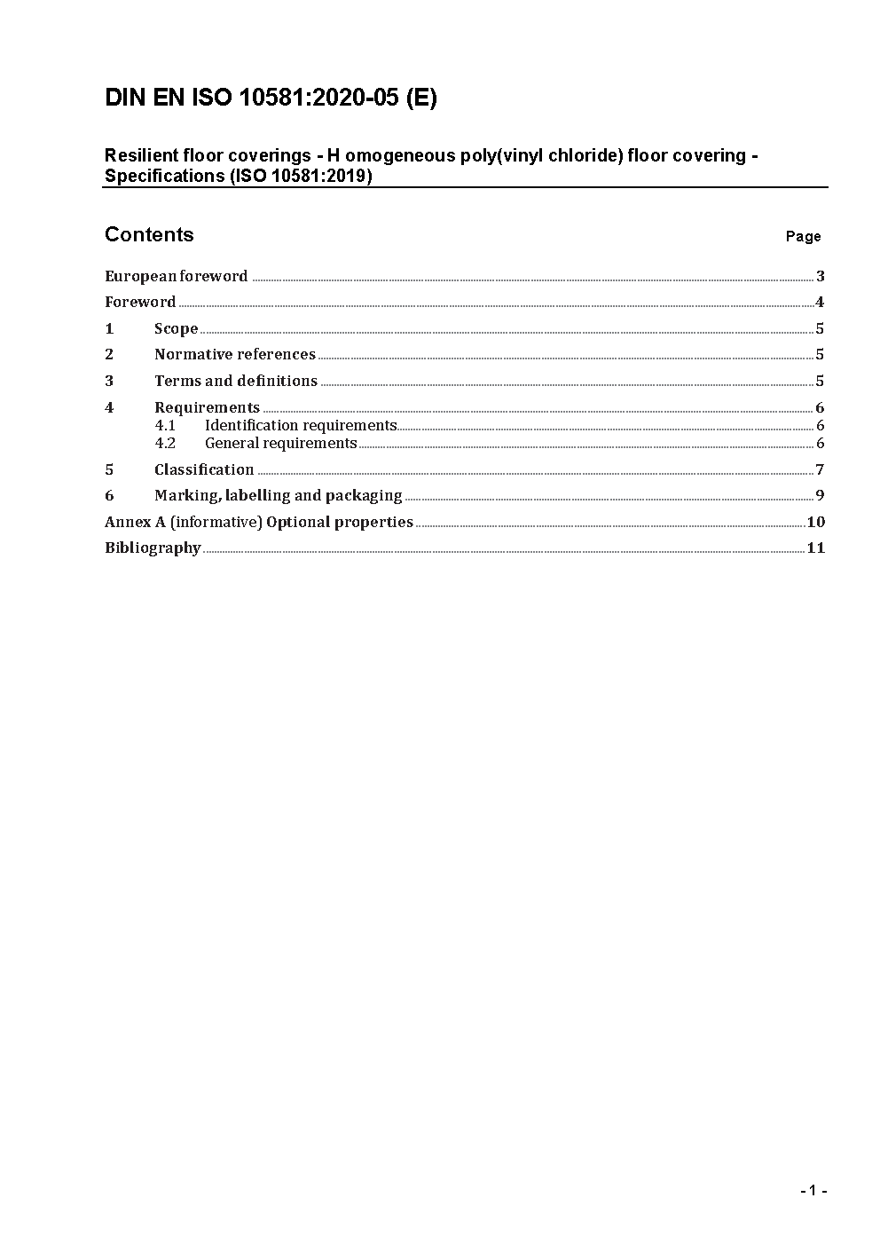 This standard specifies the characteristics of homogeneous floor coverings, based on poly(vinyl chloride), supplied in either tile or roll form. Products may contain a transparent, non-PVC factory finish. To encourage the consumer to make an informed choice, this International standard includes a classification system (see ISO 10874) based on intensity of use, which shows where these floor coverings should give satisfactory service. ISO 10581:2011 also specifies requirements for marking.