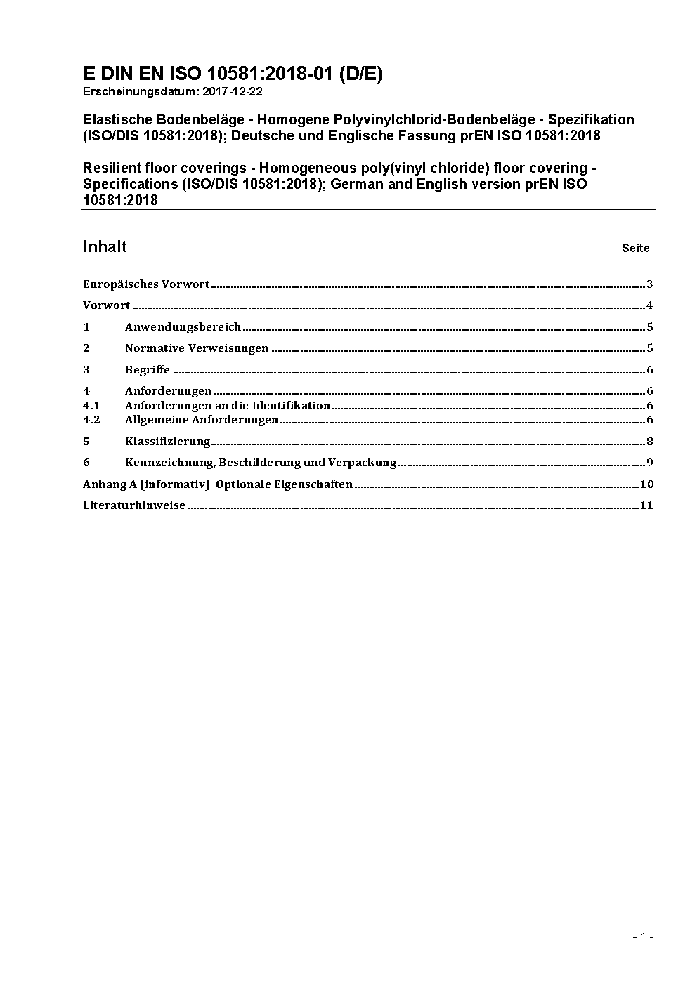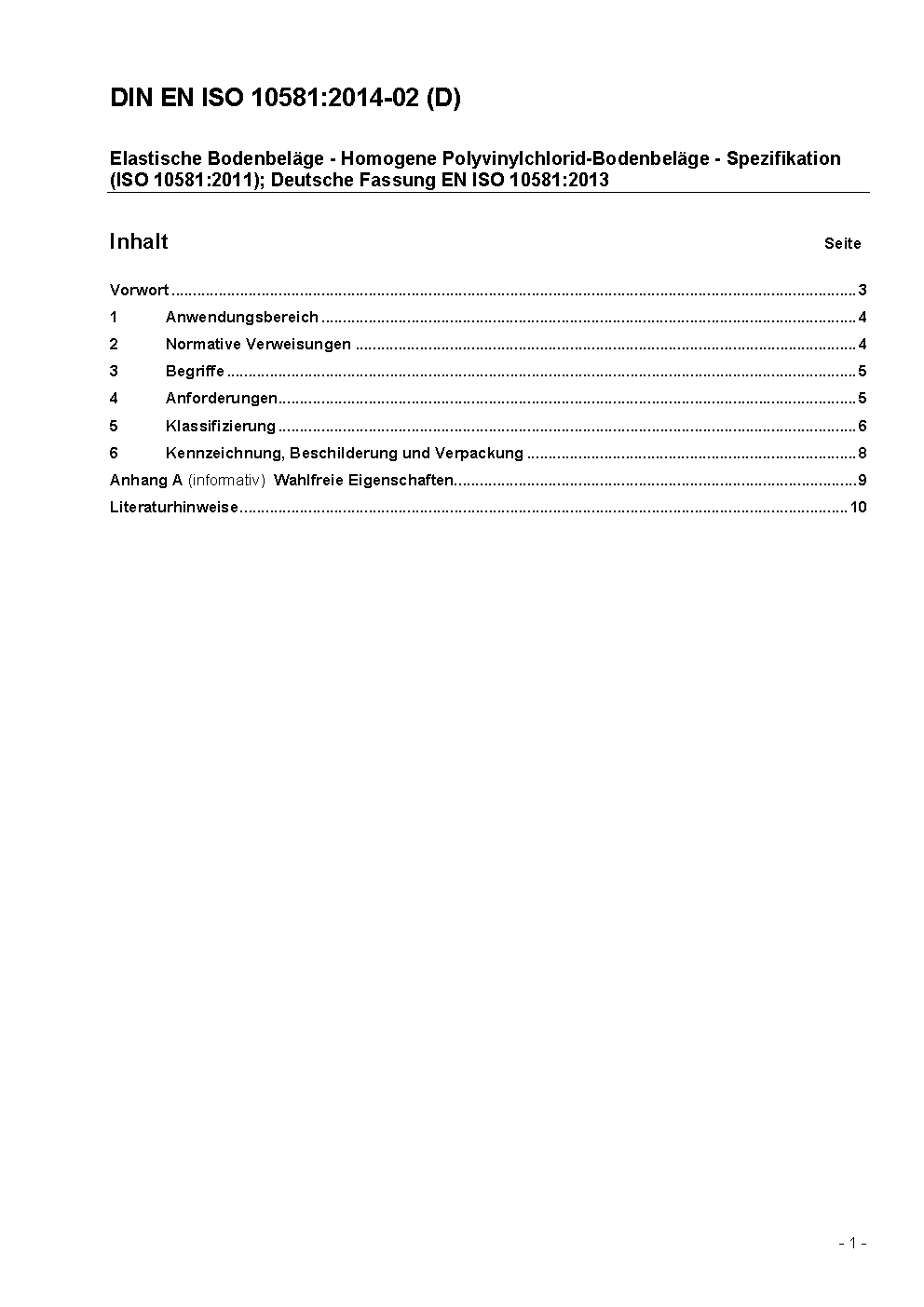 Resilient floor coverings - Homogeneous poly(vinyl chloride) floor covering - Specification (ISO 10581:2011); German version EN ISO 10581:2013