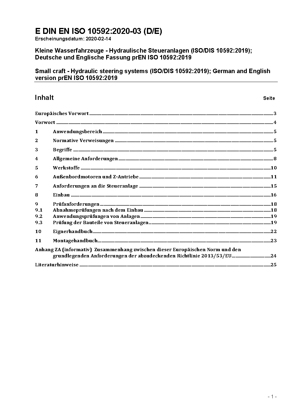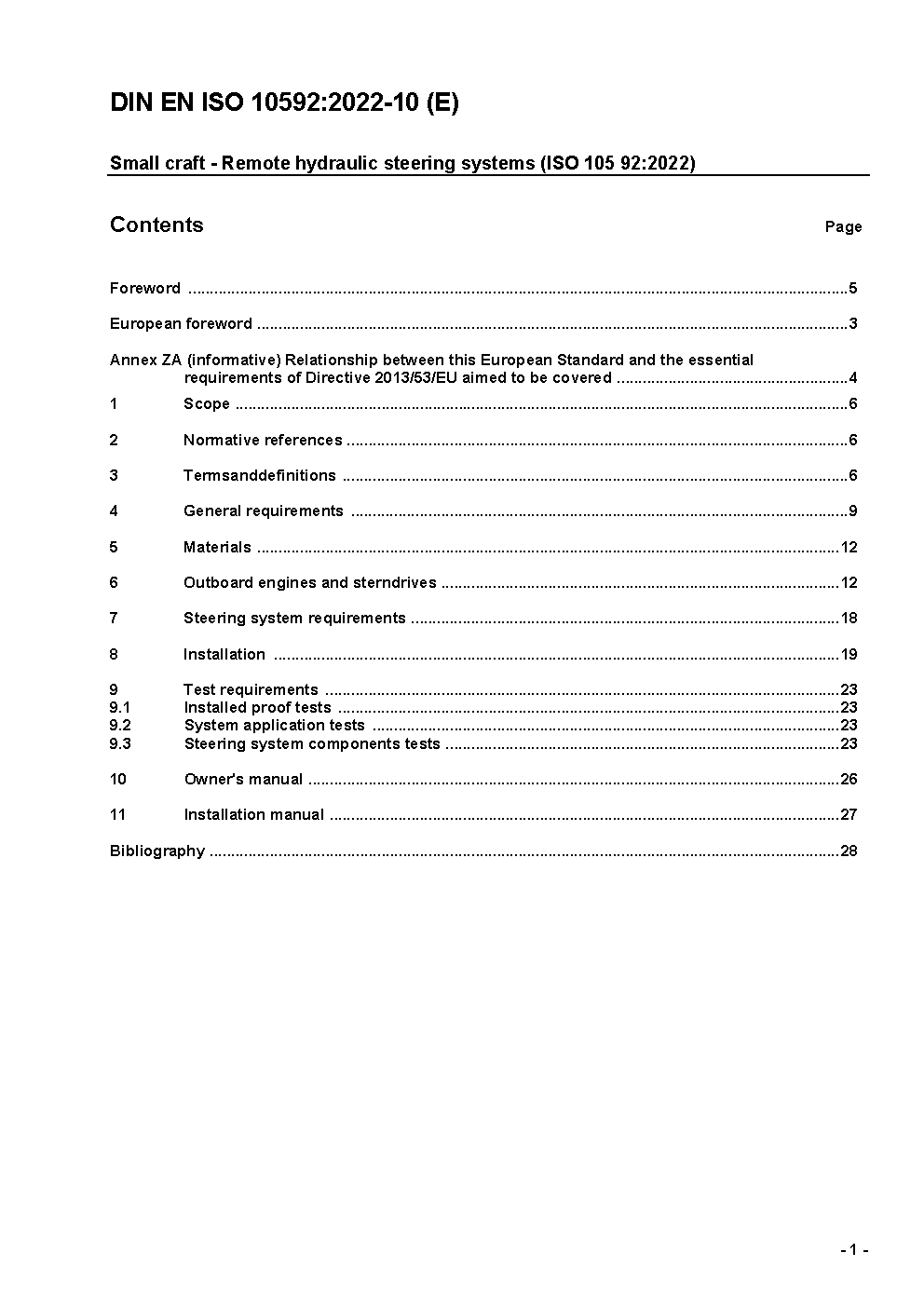 The document specifies requirements and test methods for hydraulic steering systems and components from the wheel to the interface pount for outboard motor, inboard motor and inboard-outdrive steering arrangements, used on small craft up to 24 m hull length. Accessories connecting output rams to tiller arms or equivalent are not included.