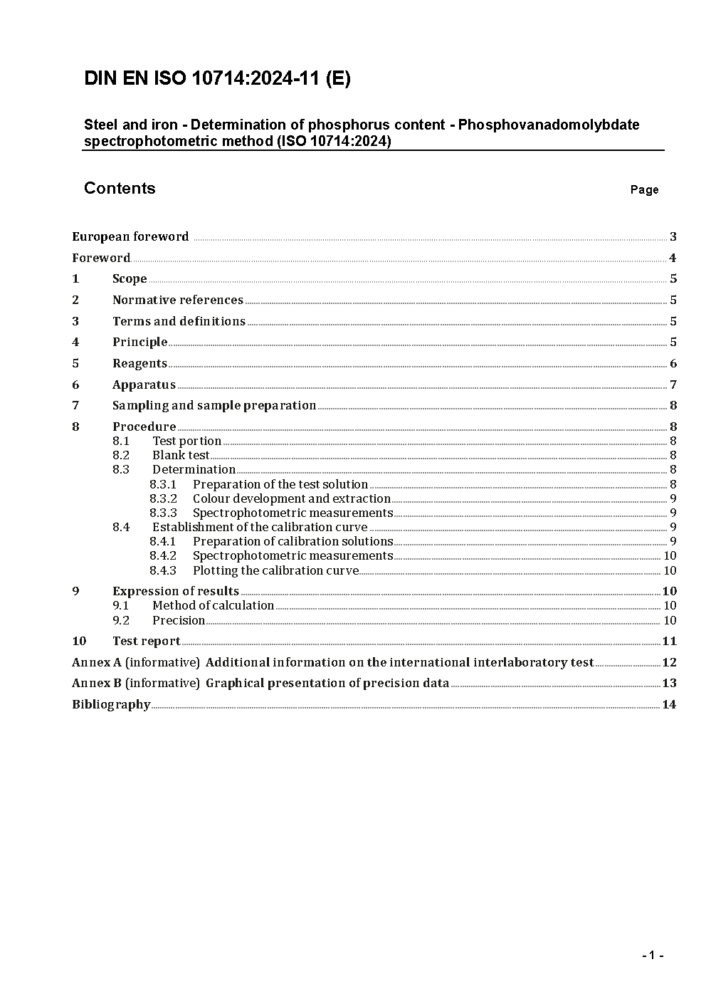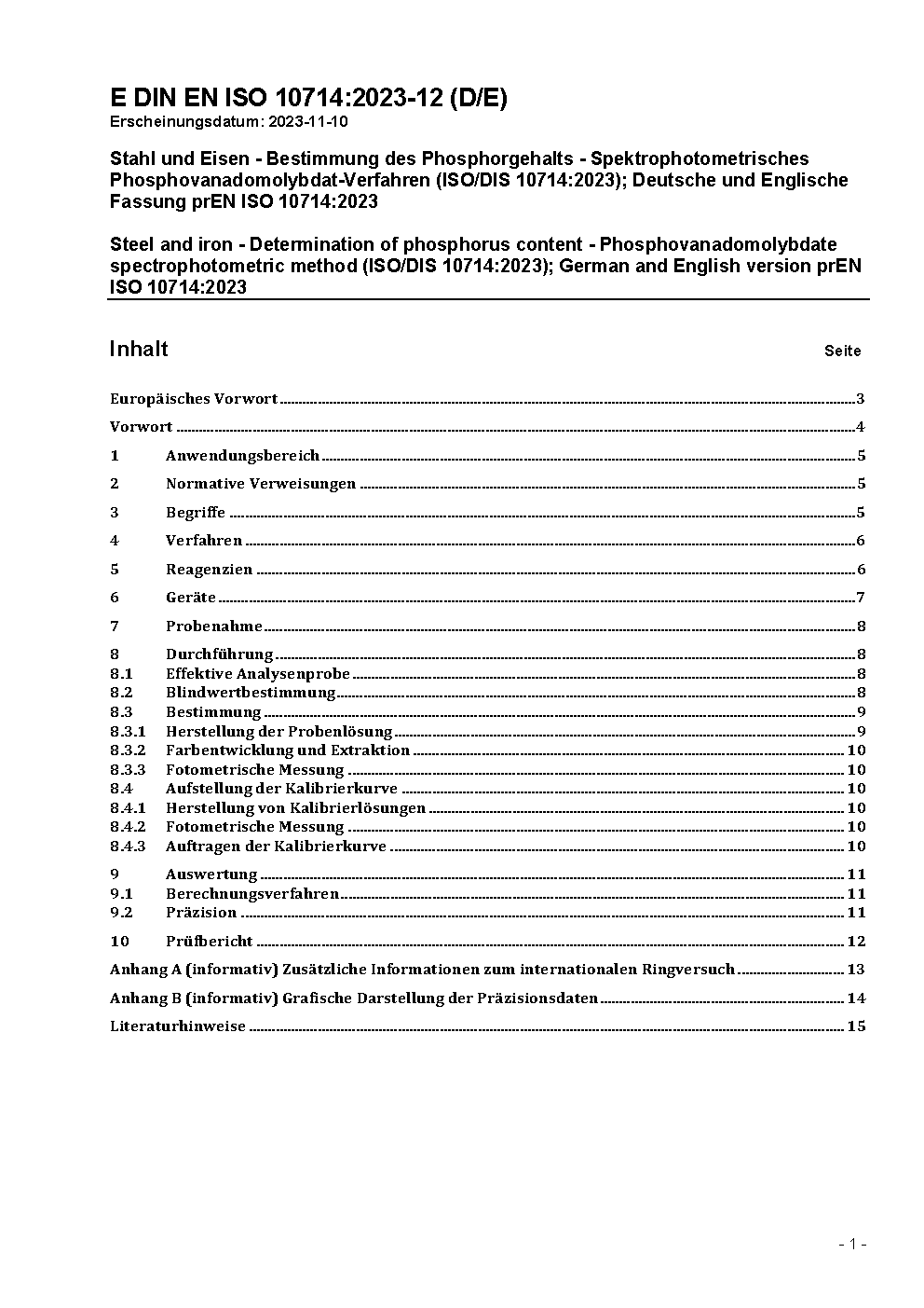 Stahl und Eisen - Bestimmung des Phosphorgehalts - Spektrophotometrisches Phosphovanadomolybdat-Verfahren (ISO/DIS 10714:2023); Deutsche und Englische Fassung prEN ISO 10714:2023