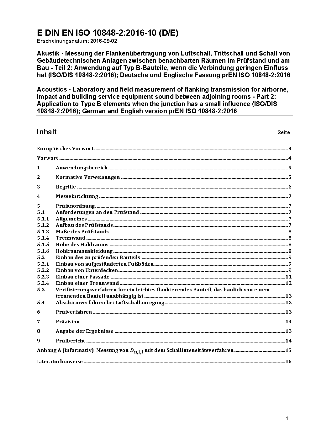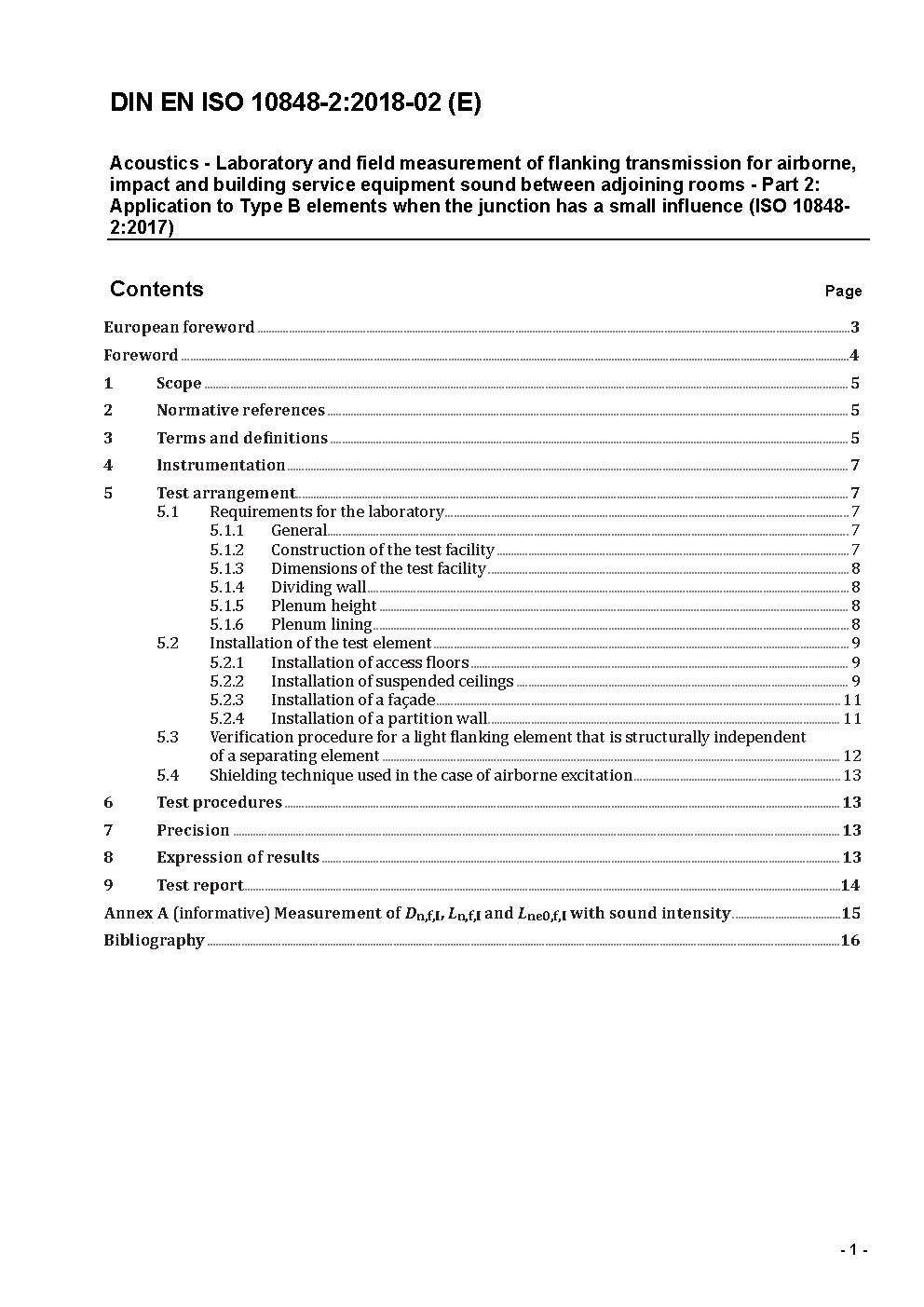 The general standard describes measurement methods to be performed in dedicated test facility in order to characterise the performances of one or several building components regarding the flanking transmissions. These performances can be used to compare different products, or to express a requirement, or to input into prediction methods, such as the series EN 12354-1 and EN 12354-2.