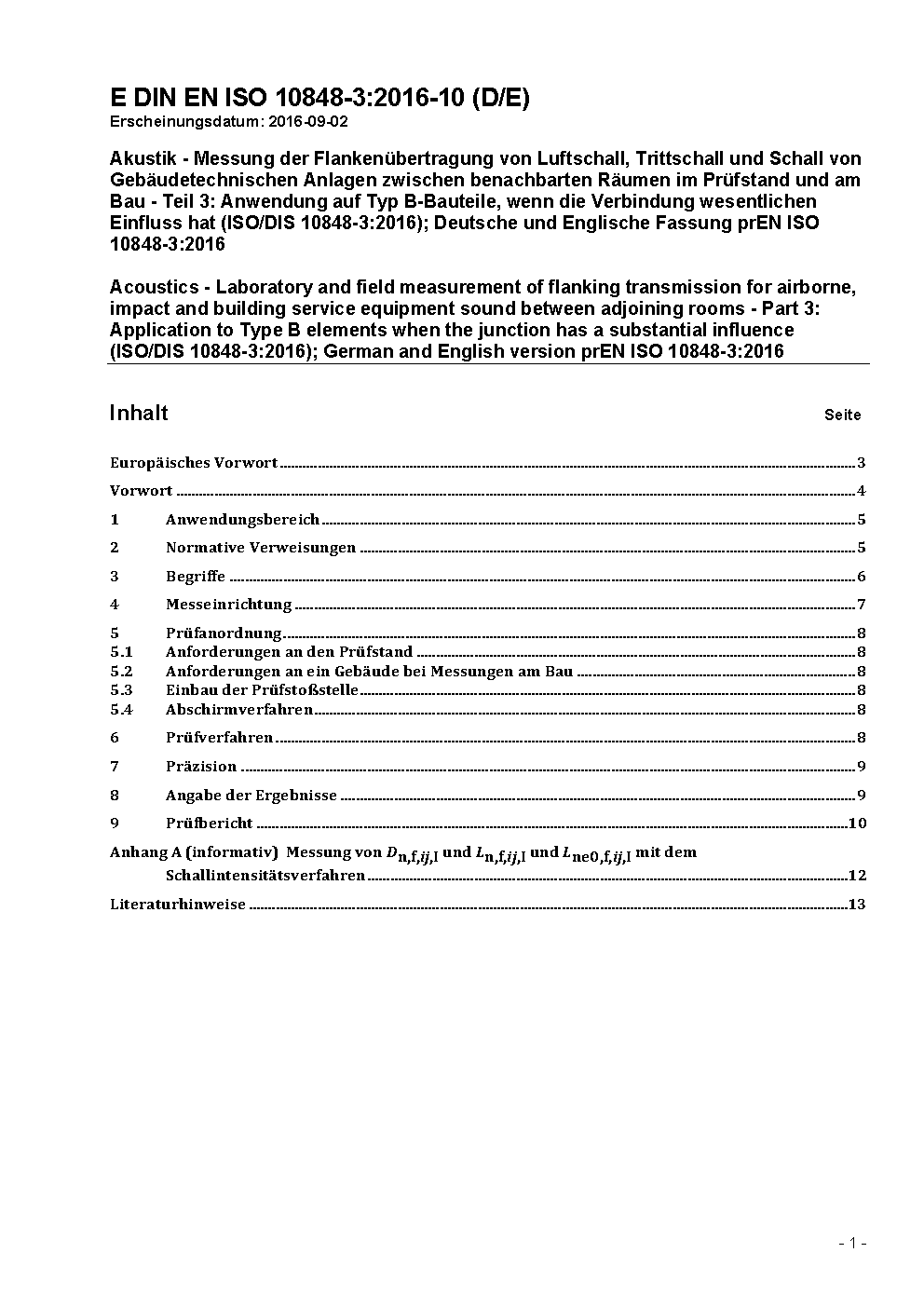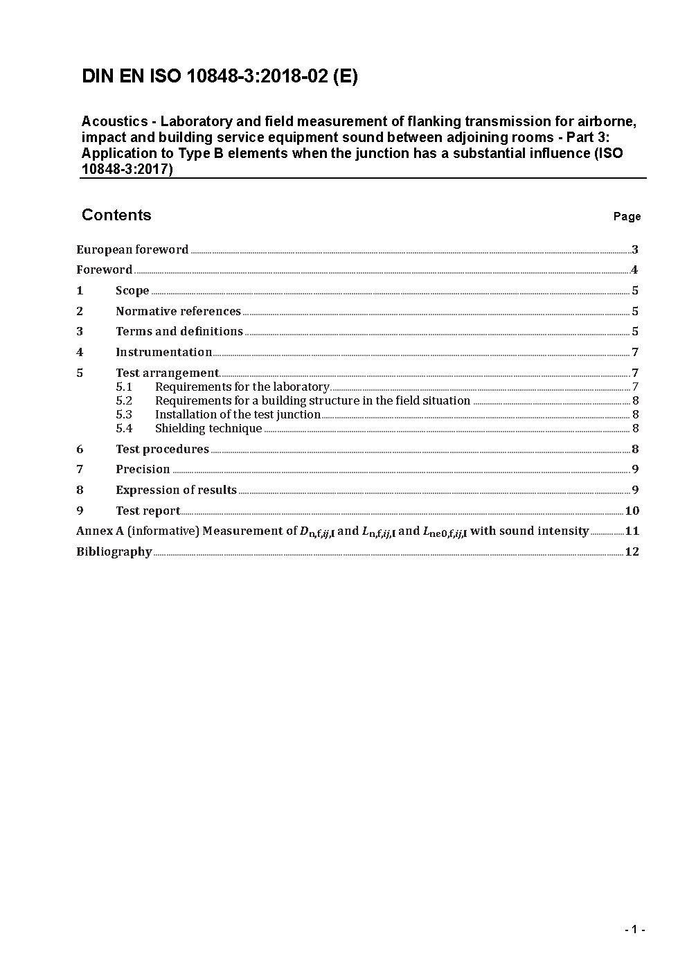 The general standard describes measurement methods to be performed in dedicated test facility in order to characterise the performances of one or several building components regarding the flanking transmissions. The determined performance can be used to compare different products, or to express a requirement, or to input into prediction methods, such as the series EN 12354.