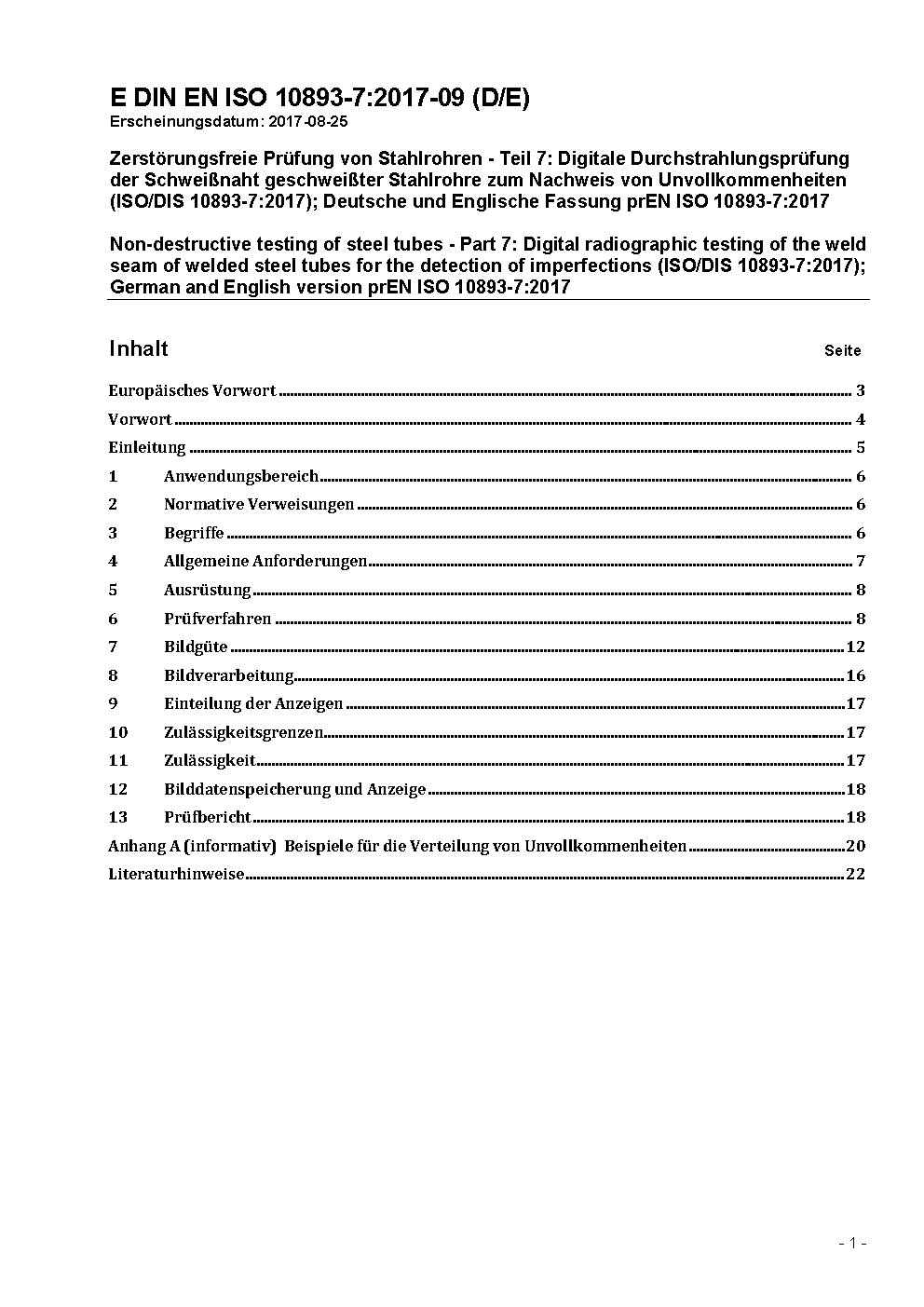 Zerstörungsfreie Prüfung von Stahlrohren - Teil 7: Digitalisierte Durchstrahlungsprüfung der Schweißnaht geschweißter Stahlrohre zum Nachweis von Unregelmäßigkeiten (ISO/DIS 10893-7:2008); Deutsche Fassung prEN ISO 10893-7:2009