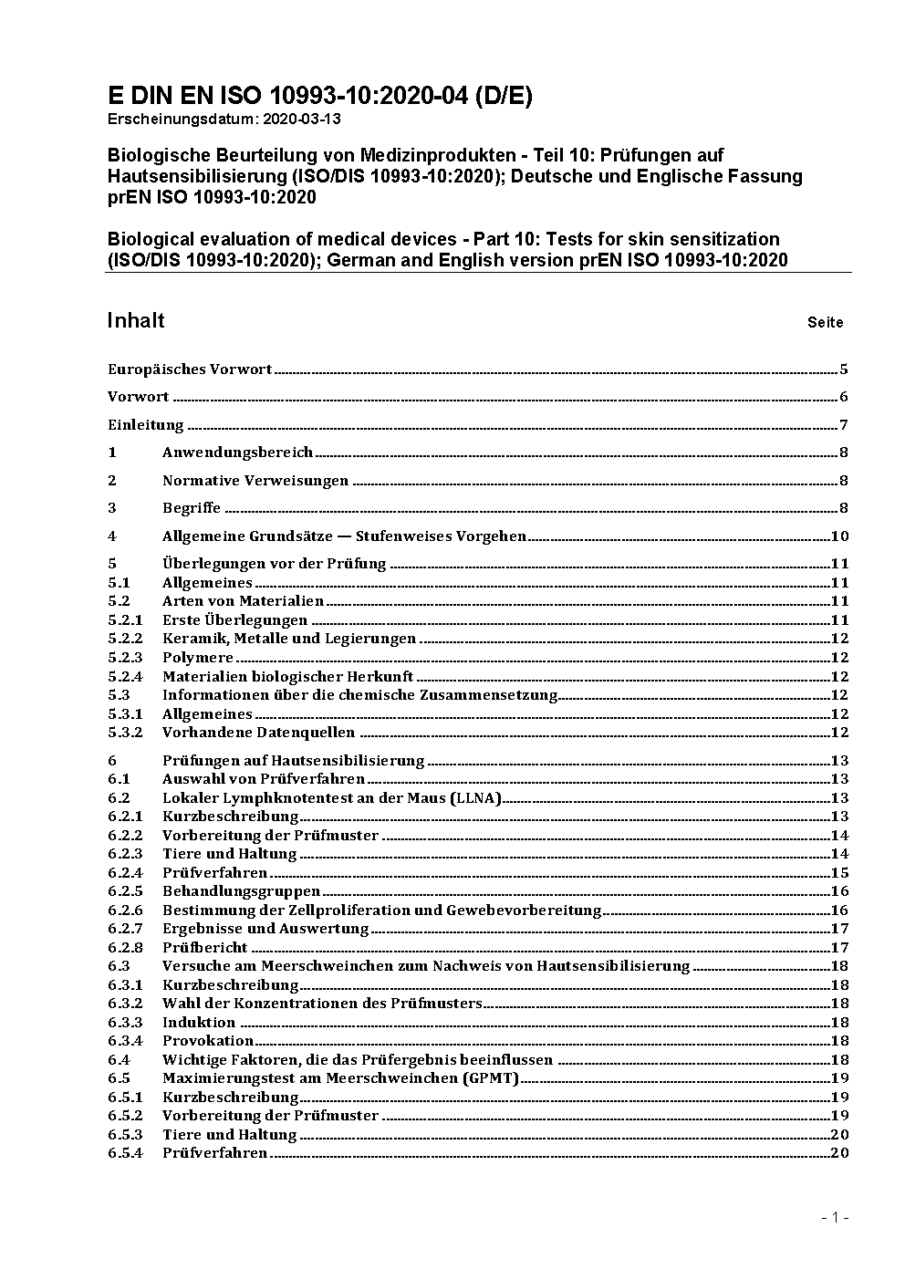 A transition period, as set out in DIN EN ISO 10993-10 (2009-08), exists until 2010-03-21.