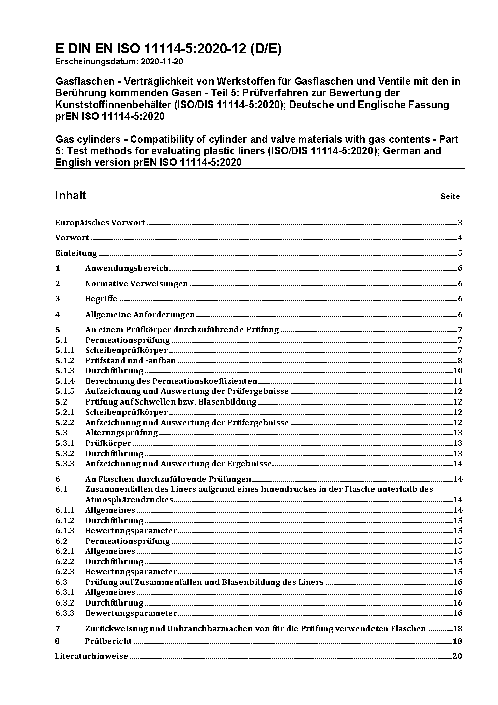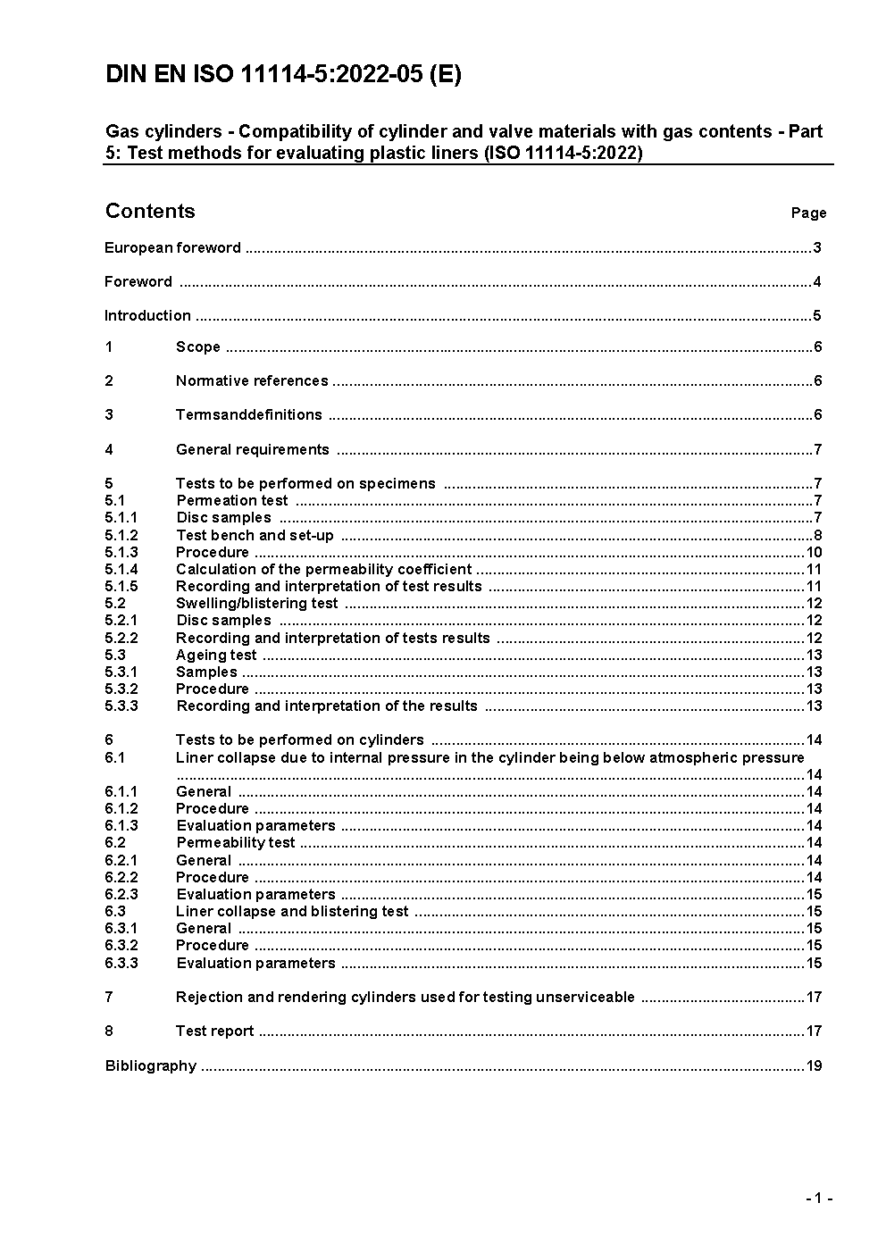 Gasflaschen - Verträglichkeit von Werkstoffen für Gasflaschen und Ventile mit den in Berührung kommenden Gasen - Teil 5: Prüfverfahren zur Bewertung der Kunststoffinnenbehälter (ISO 11114-5:2022); Deutsche Fassung EN ISO 11114-5:2022