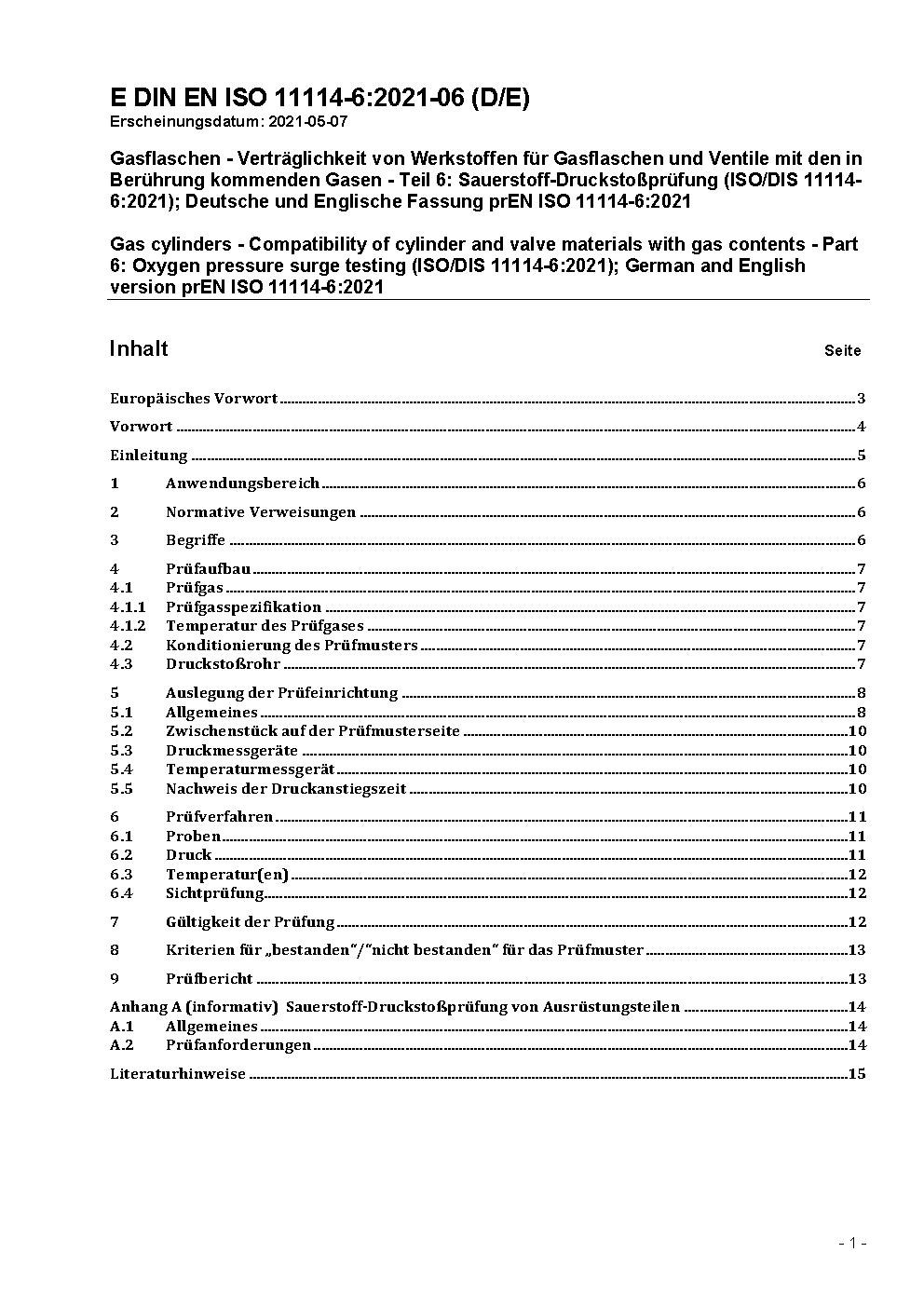 Gas cylinders - Compatibility of cylinder and valve materials with gas contents - Part 6: Oxygen pressure surge testing (ISO 11114-6:2022); German version EN ISO 11114-6:2022