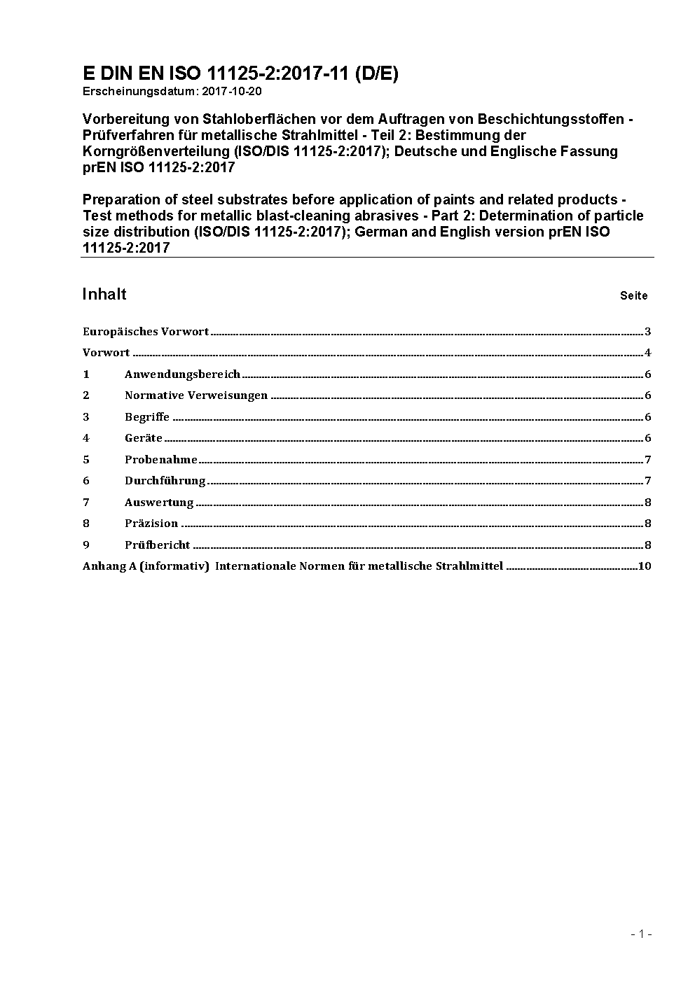The document specifies a test method for the determination of particle size distribution of blast-cleaning abrasives by sieving.