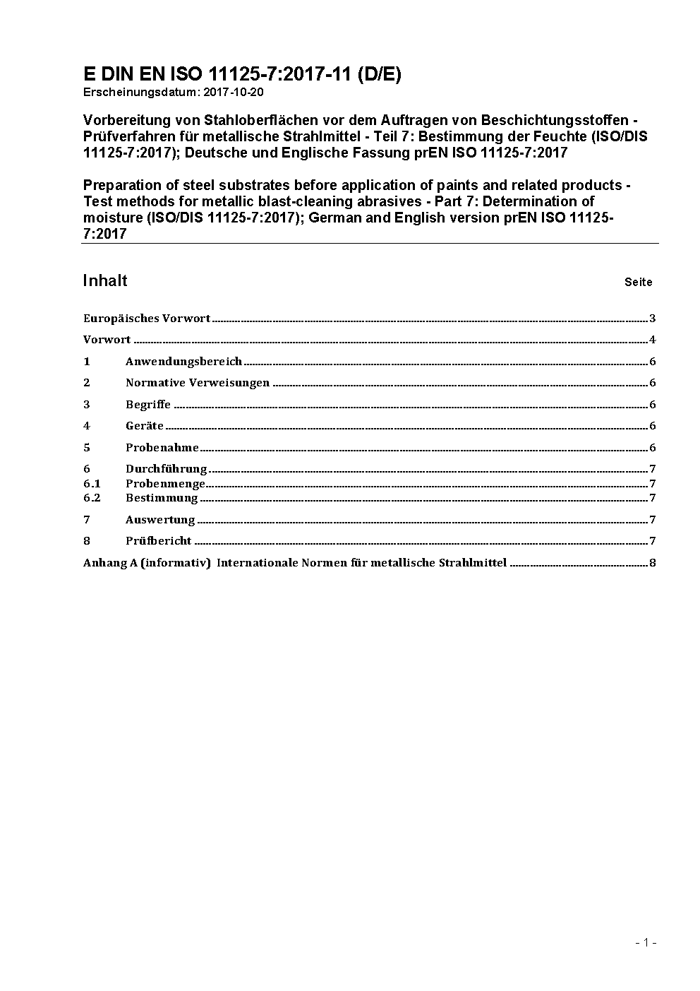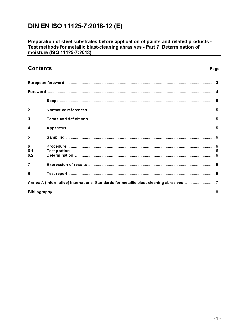 The document specifies a test method for the determination of free moisture content in metallic blast-cleaning abrasives.