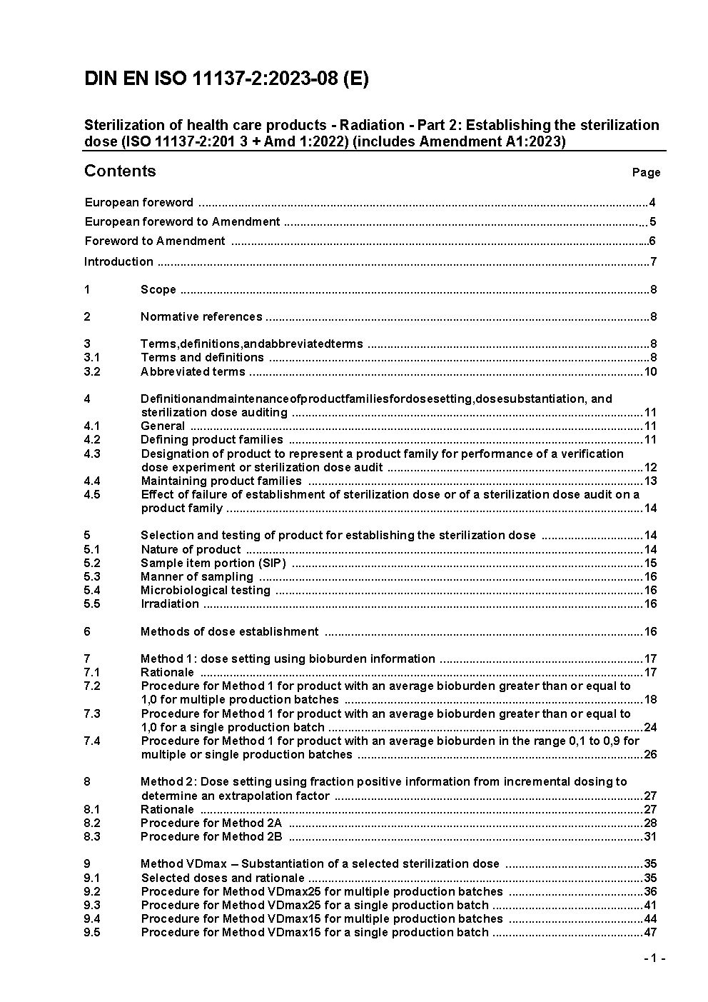 This part of ISO 11137 specifies methods of determining the minimum dose needed to achieve a specified requirement for sterility and methods to substantiate the use of 25 kGy or 15 kGy as the sterilization dose to achieve a sterility assurance level (SAL) of 10-6. This part of IS 11137 also specifies methods of dose auditing to demonstrate the continued effectiveness of the sterilization dose. This part of ISO 11137 defines product families for dose establishment and dose auditing.