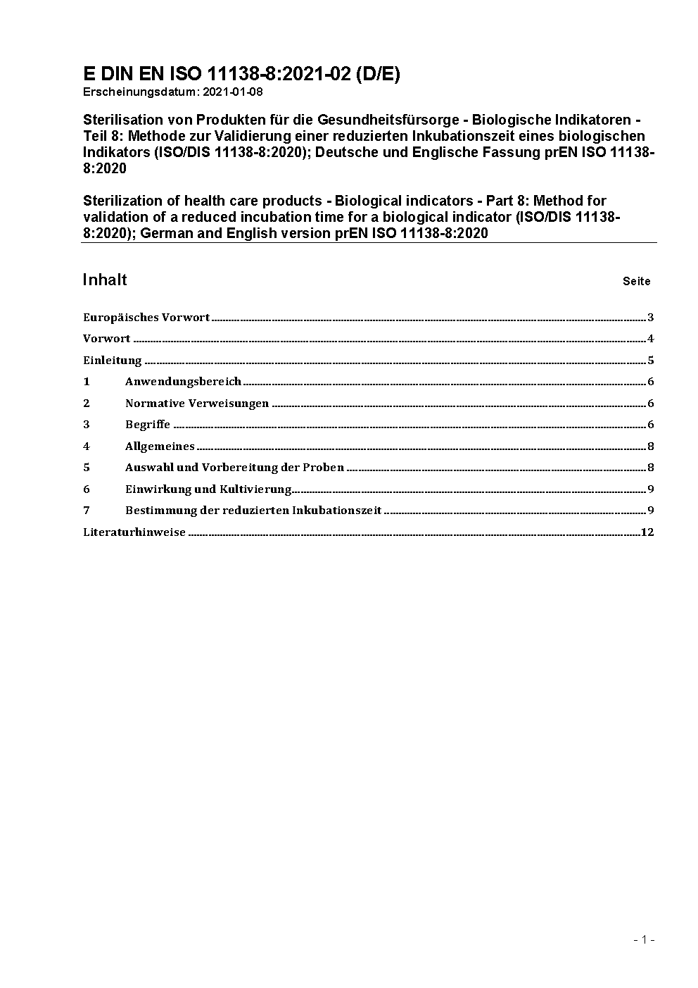 Sterilisation von Produkten für die Gesundheitsfürsorge - Biologische Indikatoren - Teil 8: Methode zur Validierung einer reduzierten Inkubationszeit eines biologischen Indikators (ISO/DIS 11138-8:2020); Deutsche und Englische Fassung prEN ISO 11138-8:2020