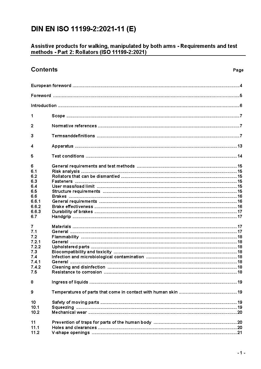 This part of ISO 11199 specifies requirements and methods of testing rollators without accessories unless specified in the particular test procedure. The methods state how to test fatigue, static load capacity and stability. The standard also gives the requirements relating to safety, ergonomics, performance, marking and labelling. The tests and requirements are based on every-day usage of rollators, manufactured for a user mass not less than 35 kg.