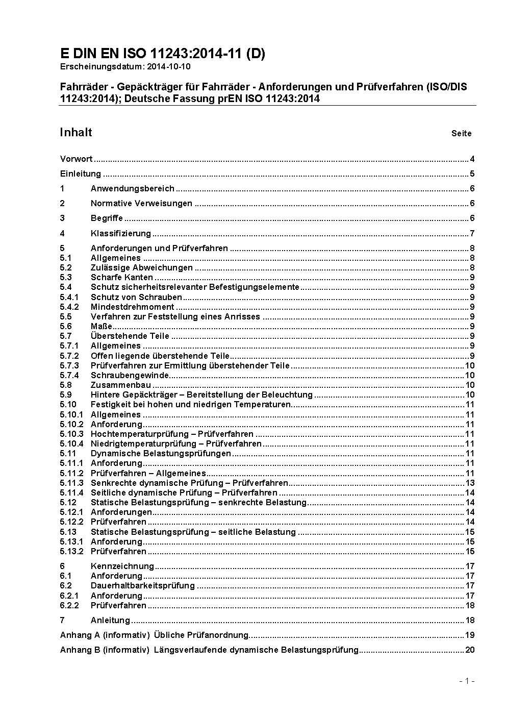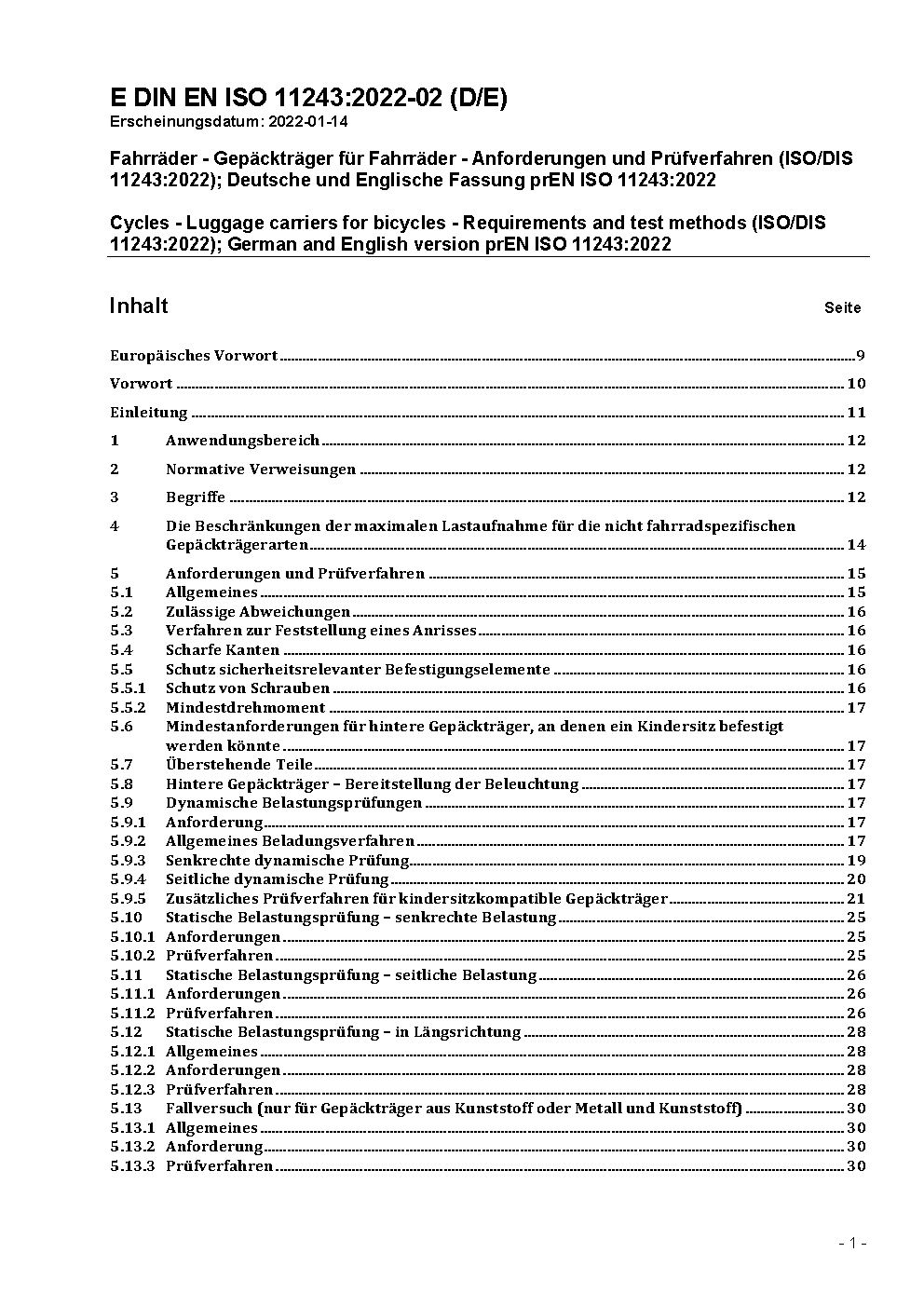 Cycles - Luggage carriers for bicycles - Requirements and test methods (ISO/DIS 11243:2014); German version prEN ISO 11243:2014