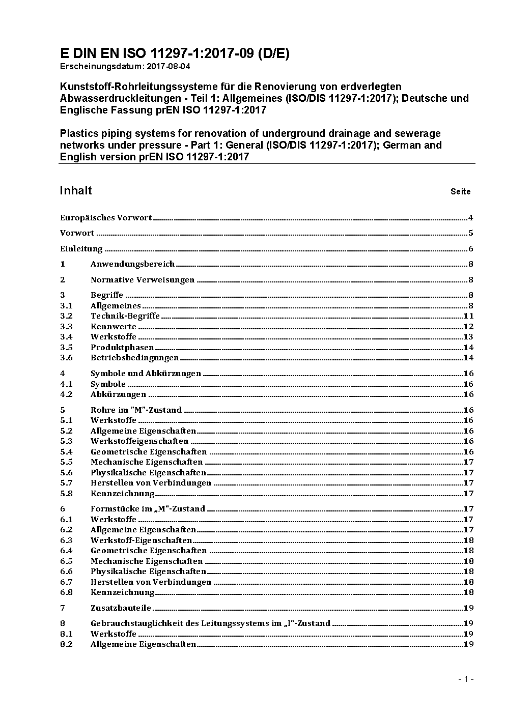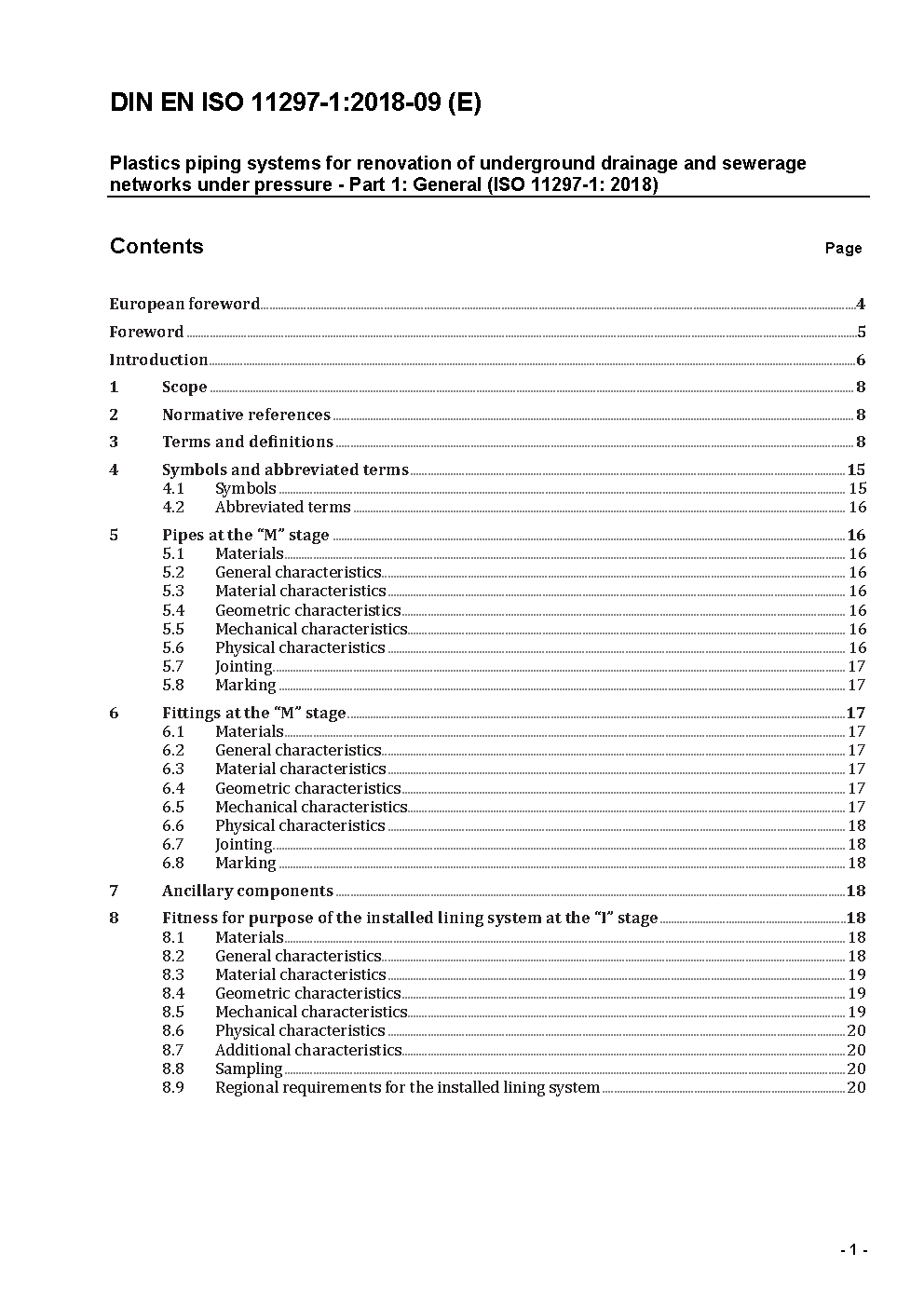 Plastics piping systems for renovation of underground drainage and sewerage networks under pressure - Part 1: General (ISO 11297-1:2018); German version EN ISO 11297-1:2018