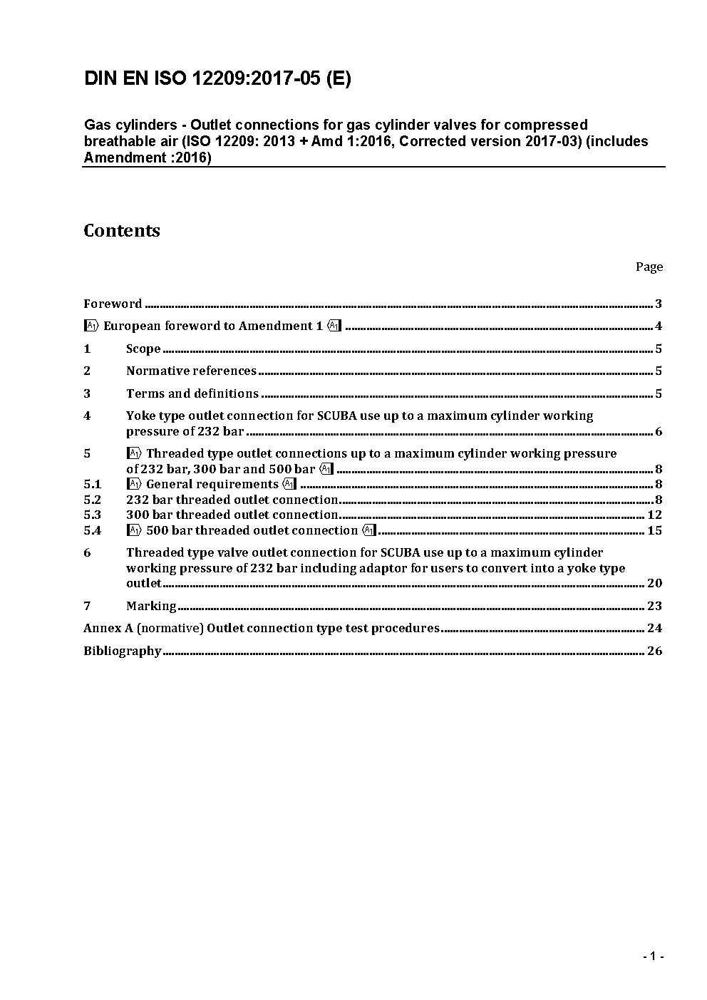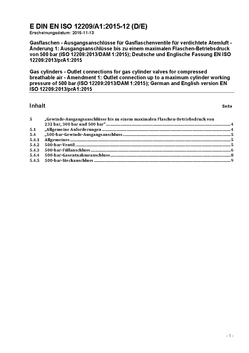 Gas cylinders - Outlet connections for gas cylinder valves for compressed breathable air - Amendment 1: Outlet connection up to a maximum cylinder working pressure of 500 bar (ISO 12209:2013/DAM 1:2015); German and English version EN ISO 12209:2013/prA1:2015