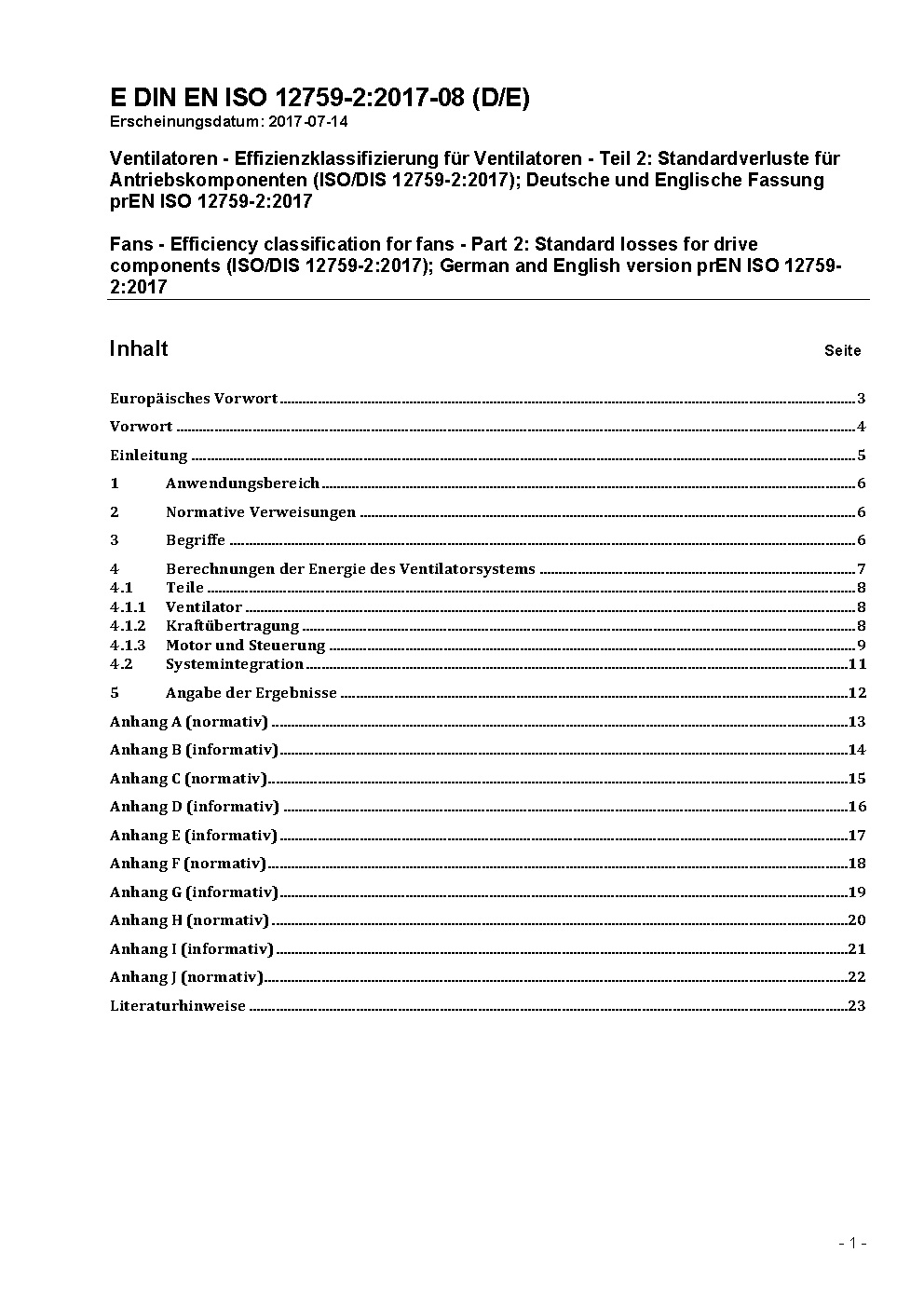 Fans - Efficiency classification for fans - Part 2: Standard losses for drive components (ISO/DIS 12759-2:2017); German and English version prEN ISO 12759-2:2017