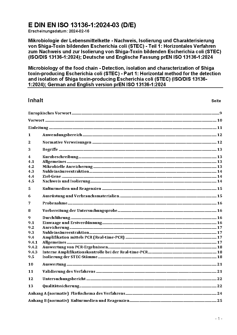 Mikrobiologie der Lebensmittelkette - Nachweis, Isolierung und Charakterisierung von Shiga-Toxin bildenden Escherichia coli (STEC) - Teil 1: Horizontales Verfahren zum Nachweis und zur Isolierung von Shiga-Toxin bildenden Escherichia coli (STEC) (ISO/DIS 13136-1:2024); Deutsche und Englische Fassung prEN ISO 13136-1:2024